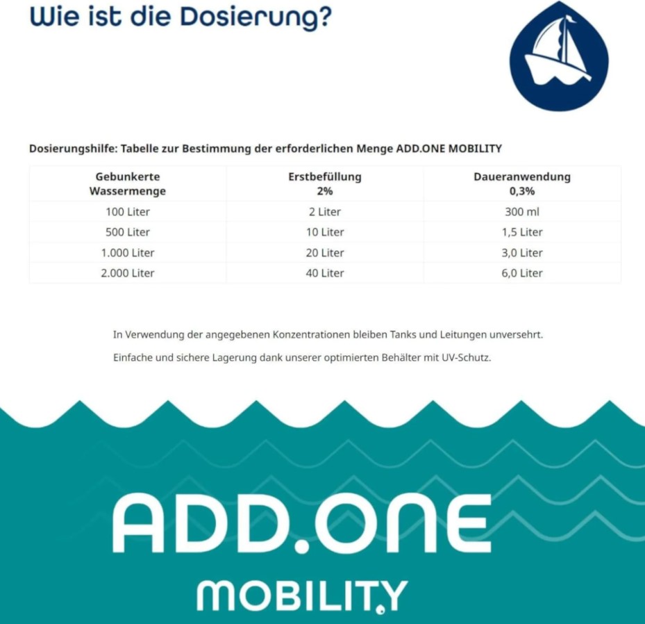 ADD.ONE Mobility eignet sich perfekt für die Trinkwasserdesinfektion auf Yachten, Segelbooten, Hausbooten und Schiffen. Es kann direkt in Frischwassertanks, Rohrleitungen und Pumpensysteme dosiert werden. So bleibt das gesamte Trinkwassersystem keimfrei, geruchlos und geschmacklich neutral – auch bei längeren Standzeiten oder in warmem Klima.
