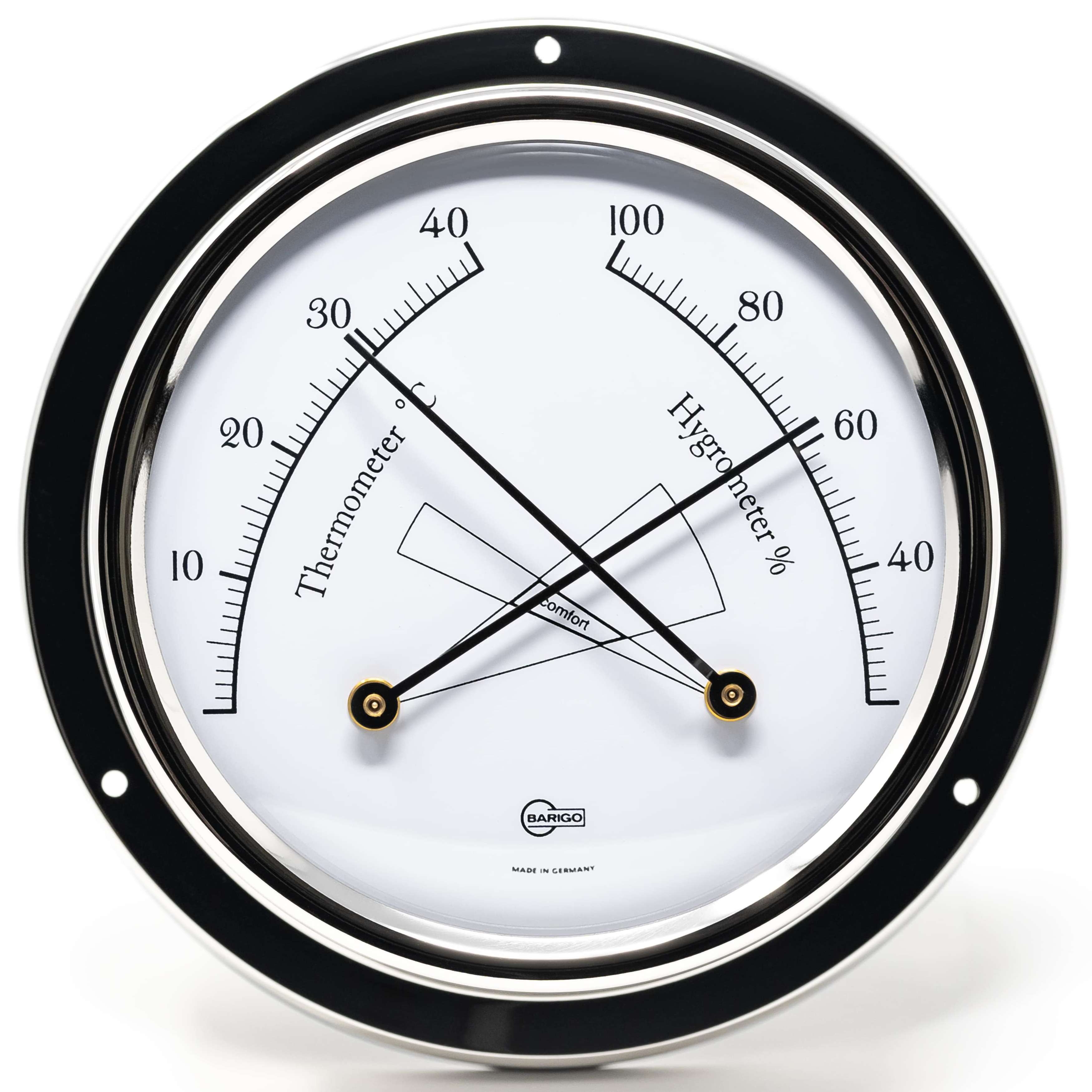 Das BARIGO Thermo-Hygrometer 983RFPO TEMPO kombiniert zwei wichtige Funktionen in einem Instrument: Temperatur- und Luftfeuchtigkeitsmessung – präzise, übersichtlich und stilvoll verpackt im hochwertigen polierten Edelstahlgehäuse (RFPO). Mit einem kompakten Durchmesser von 110 mm ist es ideal für den Innenbereich auf Booten, Yachten und Schiffen geeignet.