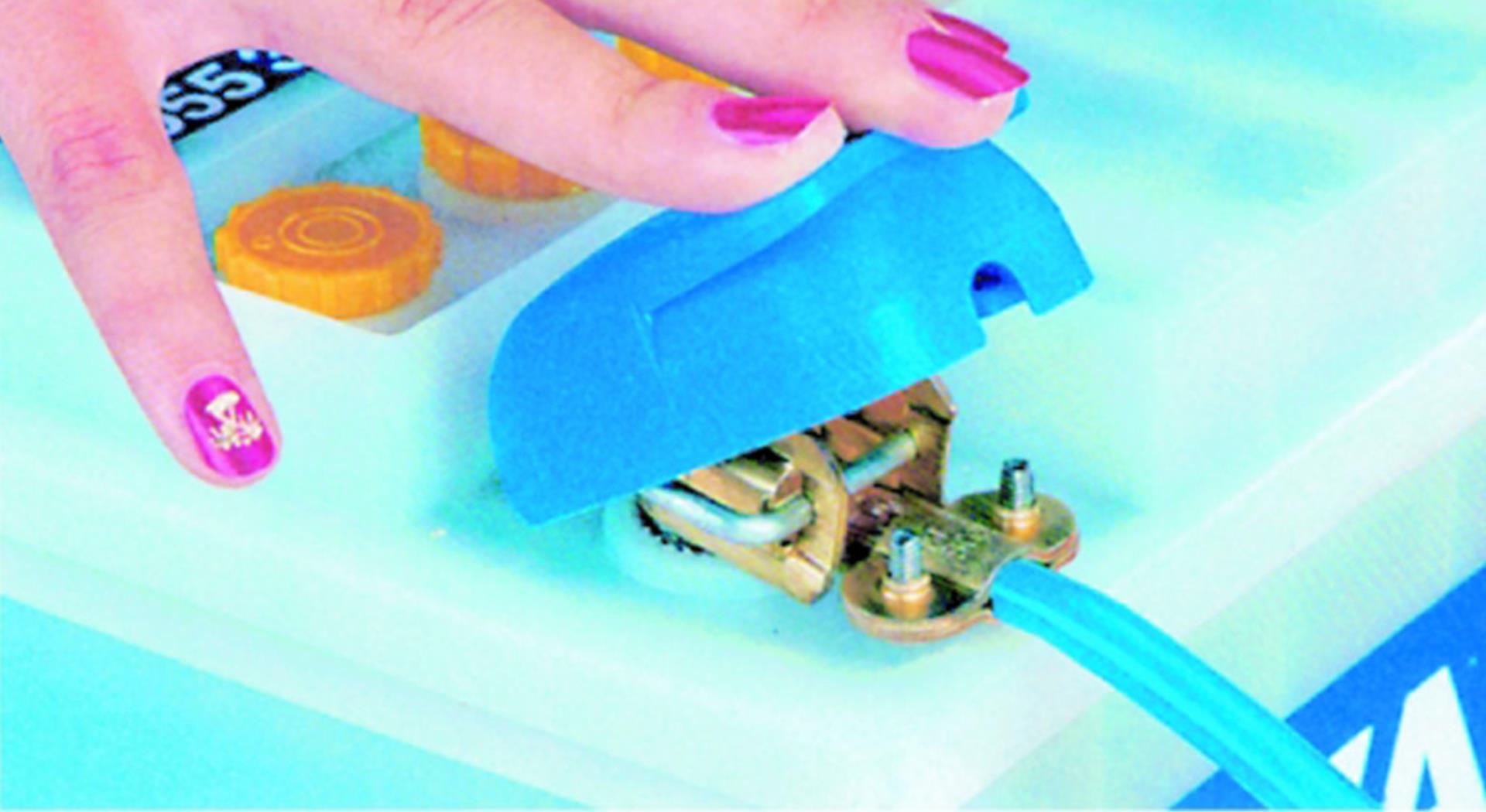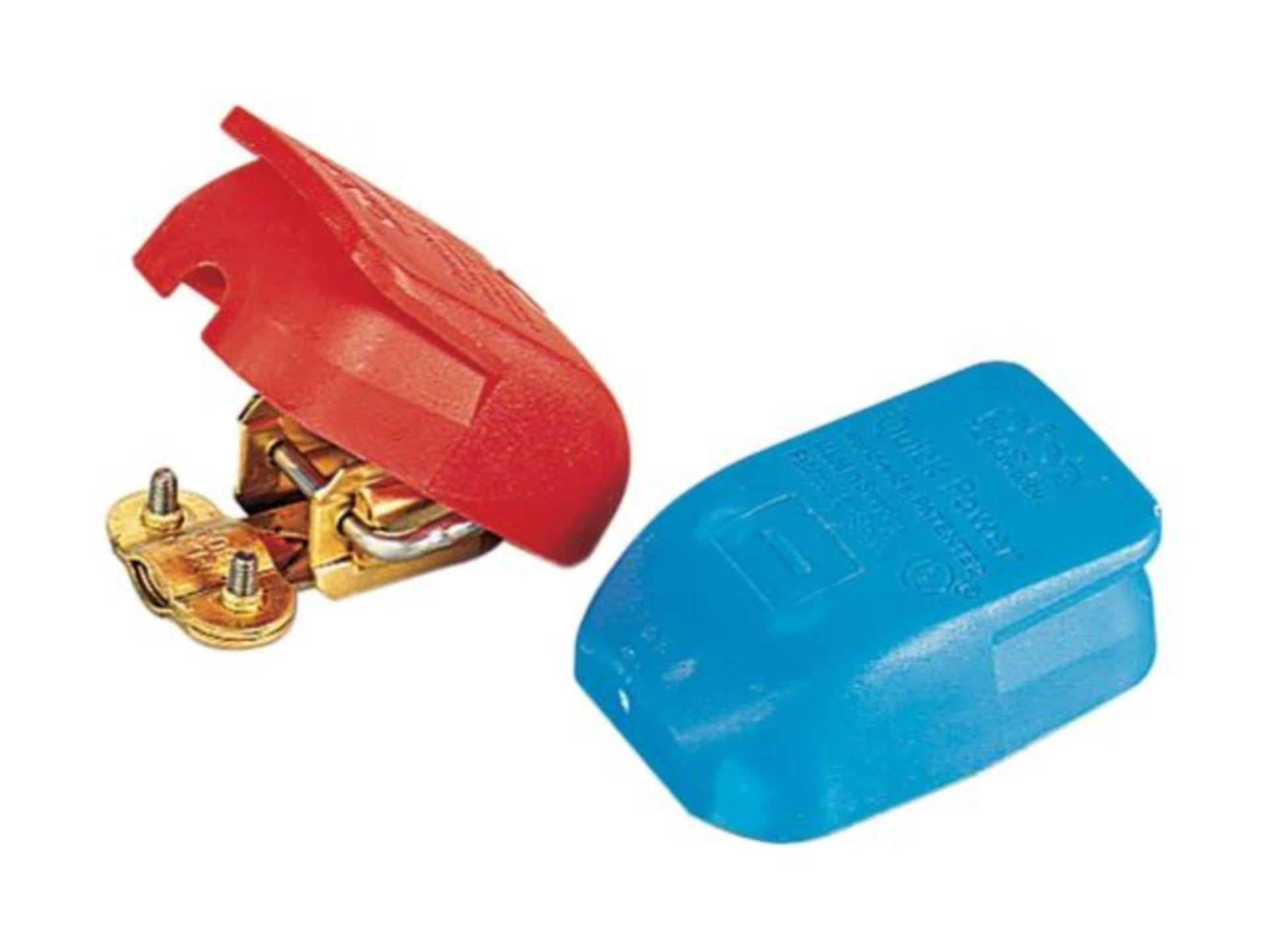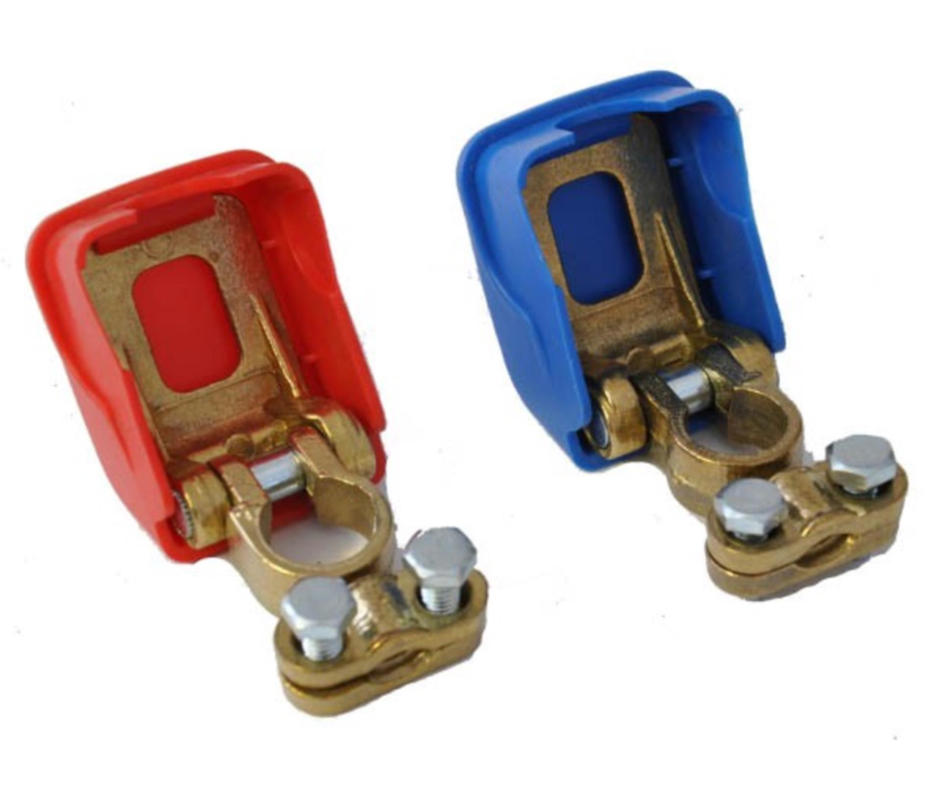 Praktische Polklemmen mit Schnellverschluss und PVC-Abdeckung gegen Funkenschlag. Montage erfolgt ohne Schrauben, einfach aufklippen.