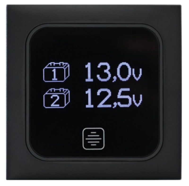 Über das übersichtliche Display lassen sich zwei getrennte 12-V-Batteriekreise bequem überwachen. Der aktuelle Ladezustand wird digital angezeigt und ermöglicht eine schnelle Einschätzung der Batterieleistung – ein wichtiger Faktor für Sicherheit, Planung und Energieeffizienz an Bord. Dank der Touch-Bedienung entfällt der Einsatz mechanischer Schalter, was den Bedienkomfort erhöht und den Verschleiß reduziert.
