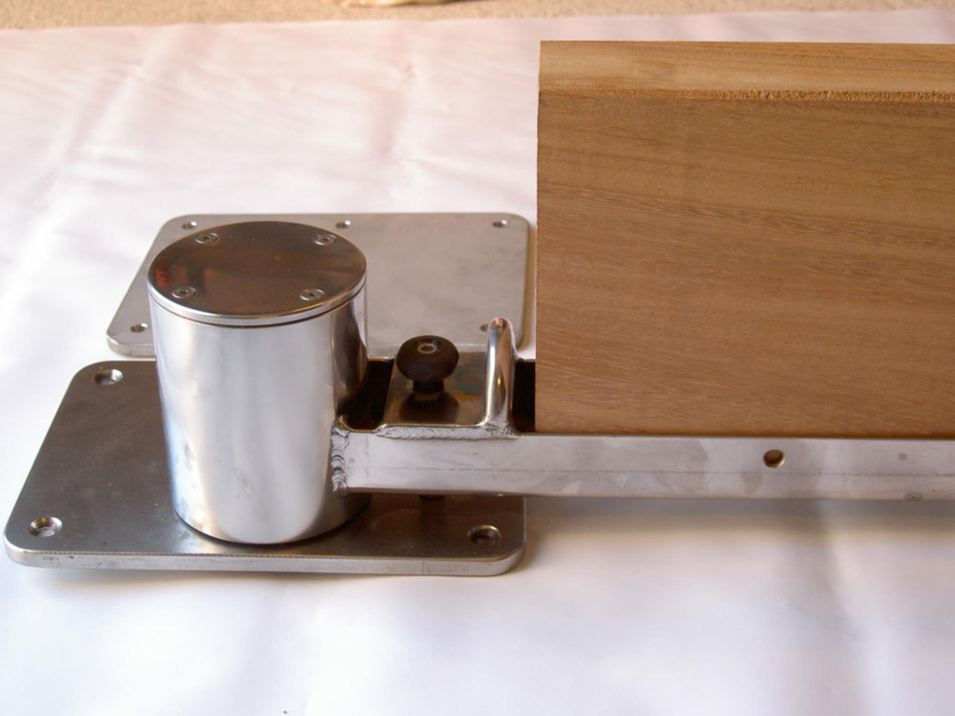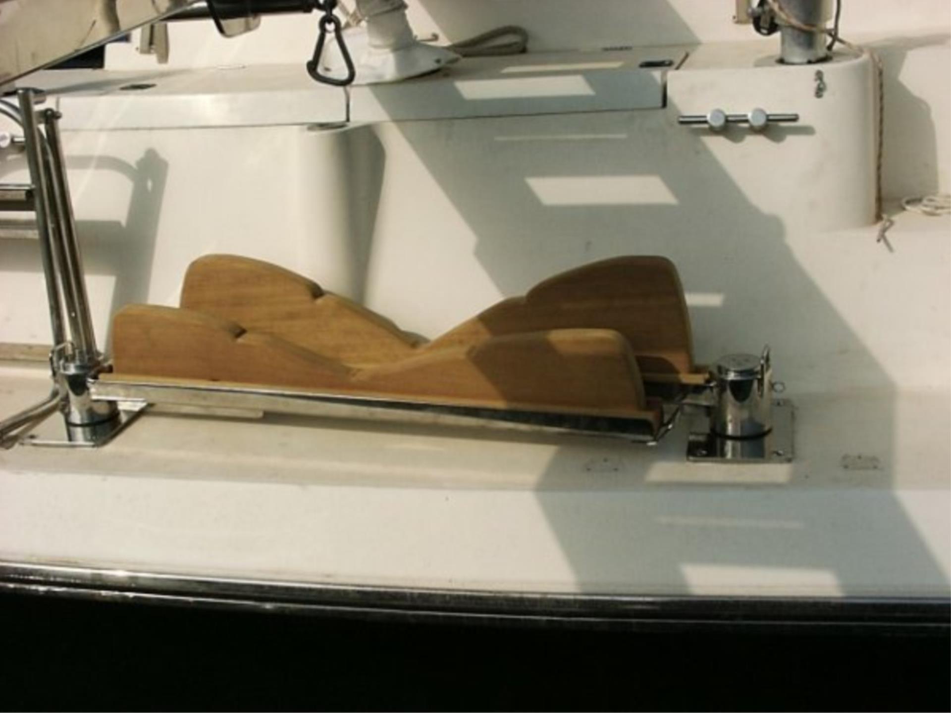 Das mitgelieferte Iroko-Holz (Teak-ähnlich) im Maß 950 × 60 × 200 mm lässt sich individuell an jede Rumpfform anpassen (noch nicht zugeschnitten). Eine integrierte Vorrichtung für Gurte sorgt für eine sichere Fixierung des Dinghys an Bord. Die beiliegenden Gegenplatten garantieren eine stabile Montage.