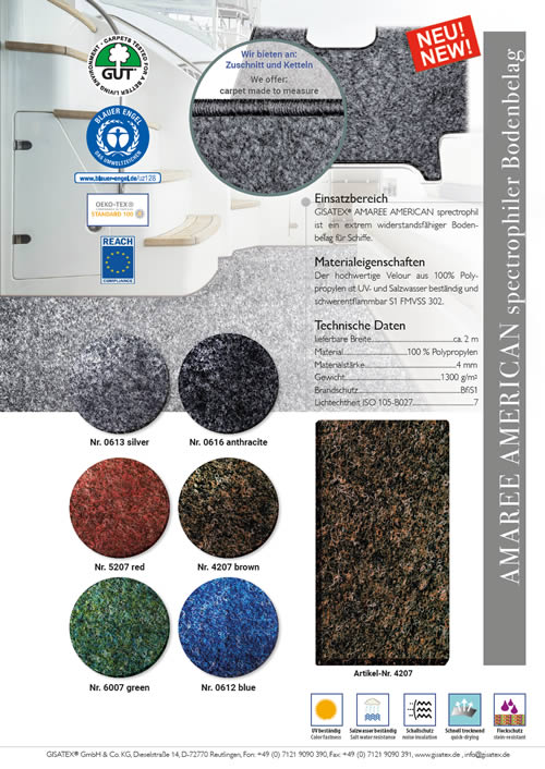 Der GISATEX Amaree Teppichboden eignet sich hervorragend für den Innenbereich von Yachten, Segel- und Motorbooten, insbesondere in Kabinen, Salons, Kojen oder auch Technikräumen. Dank seiner hohen Flexibilität und des fehlenden Teppichrückens lässt er sich mühelos auch auf gewölbten Flächen oder in schwer zugänglichen Bereichen verlegen und verkleben.