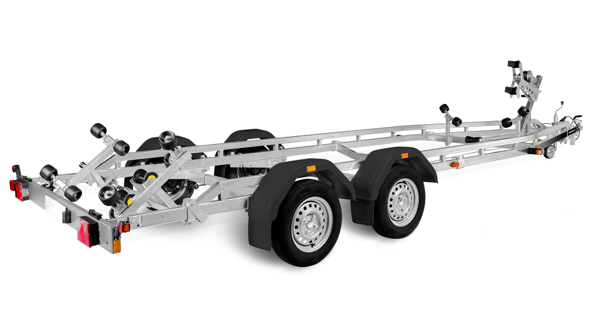 Das verstärkte V-förmige Chassis aus feuerverzinktem Stahl sorgt für hohe Stabilität und Korrosionsschutz – perfekt für den Einsatz in maritimer Umgebung. Die verstärkten Kielrollen als Wippe sowie die belastbaren Premium-Seitenrollen gewährleisten eine gleichmäßige Lastverteilung und schonende Führung des Bootsrumpfs – beim Slippen wie auf der Straße.