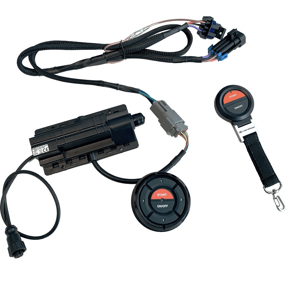 Das System besteht aus Control Box, Start Panel, Engine Box, Plug & Play Kabeln und der kabellosen Fernbedienung. Während das Start Panel am Steuerstand montiert wird und die PIN-basierte Freigabe ermöglicht, erlaubt der FOB das drahtlose Starten und Stoppen des Motors – ganz ohne Eingabe eines Codes. Gleichzeitig fungiert die Fernbedienung als drahtlose Sicherungsleine: Verlässt der Bootsführer das Boot, wird der Motor automatisch gestoppt.