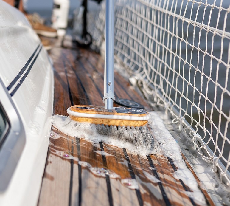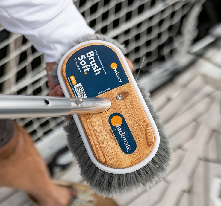 Das niederländische Unternehmen DECKMATE hat ein effizientes und benutzerfreundliches Reinigungssystem für Decks entwickelt. Das System umfasst Waschbürsten in unterschiedlichen Härtegraden, einen Wischmop und ein Trockentuch, die zusammen mit dem vielseitig einsetzbaren Teleskopstiel eine gründliche Reinigung ermöglichen. Um Oberflächen zu schonen, sind die Bürsten von einem schützenden Kunststoffpuffer umgeben. Der Teleskopstiel ist von 91 bis 182 cm verstellbar und wird mit einem Edelstahl-Federknopf gesichert. Dank des Schnellkupplungssystems lassen sich die Zubehörteile mühelos anbringen oder austauschen.