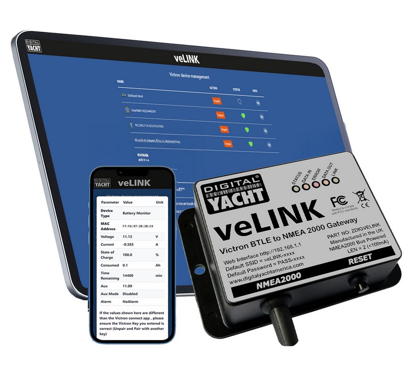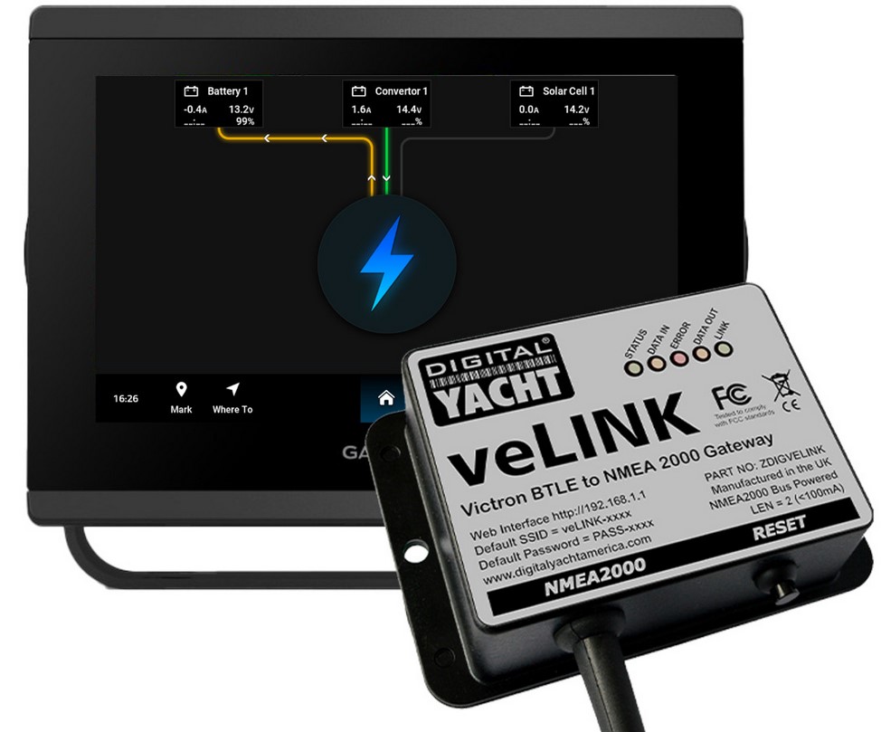 Der veLink Victron BT auf NMEA 2000 Konverter verbindet moderne Bluetooth-fähige Victron-Geräte direkt mit Ihrem NMEA 2000 Bordnetzwerk. So werden wichtige Batterie- und Energieinformationen drahtlos in Ihr bestehendes Netzwerk integriert und komfortabel auf Multifunktionsdisplays (MFD) und Kartenplottern angezeigt – ganz ohne zusätzliche App oder Smartphone.