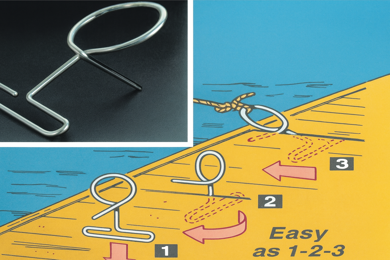 Der Dockring / Anlegering aus hochwertigem Edelstahl ermöglicht eine einfache und stabile Befestigung von Booten an Stegen – ganz ohne aufwendige Montage. Er wird einfach zwischen den Stegplanken verhakt und bietet sofort sicheren Halt für Festmacherleinen, ohne den Steg zu beschädigen.