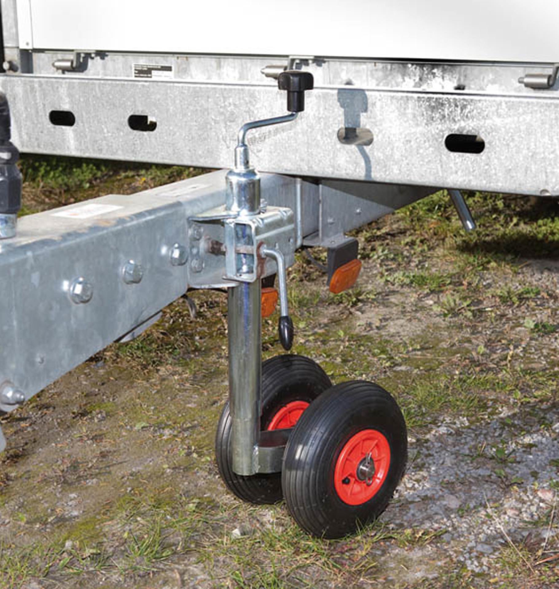 Die zwei groß dimensionierten Laufräder mit 260 x 85 mm bieten eine sichere Führung und ermöglichen ein kontrolliertes Manövrieren auch bei höherer Last. Trotz seiner robusten Ausführung überzeugt das Doppel-Stützrad durch ein geringes Eigengewicht von nur 2,44 kg – ideal für den regelmäßigen Einsatz.