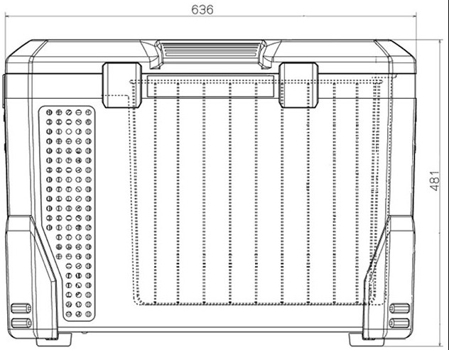 - Außenmaße: 636 × 481 × 394 mm (B × H × T, mit Griff)