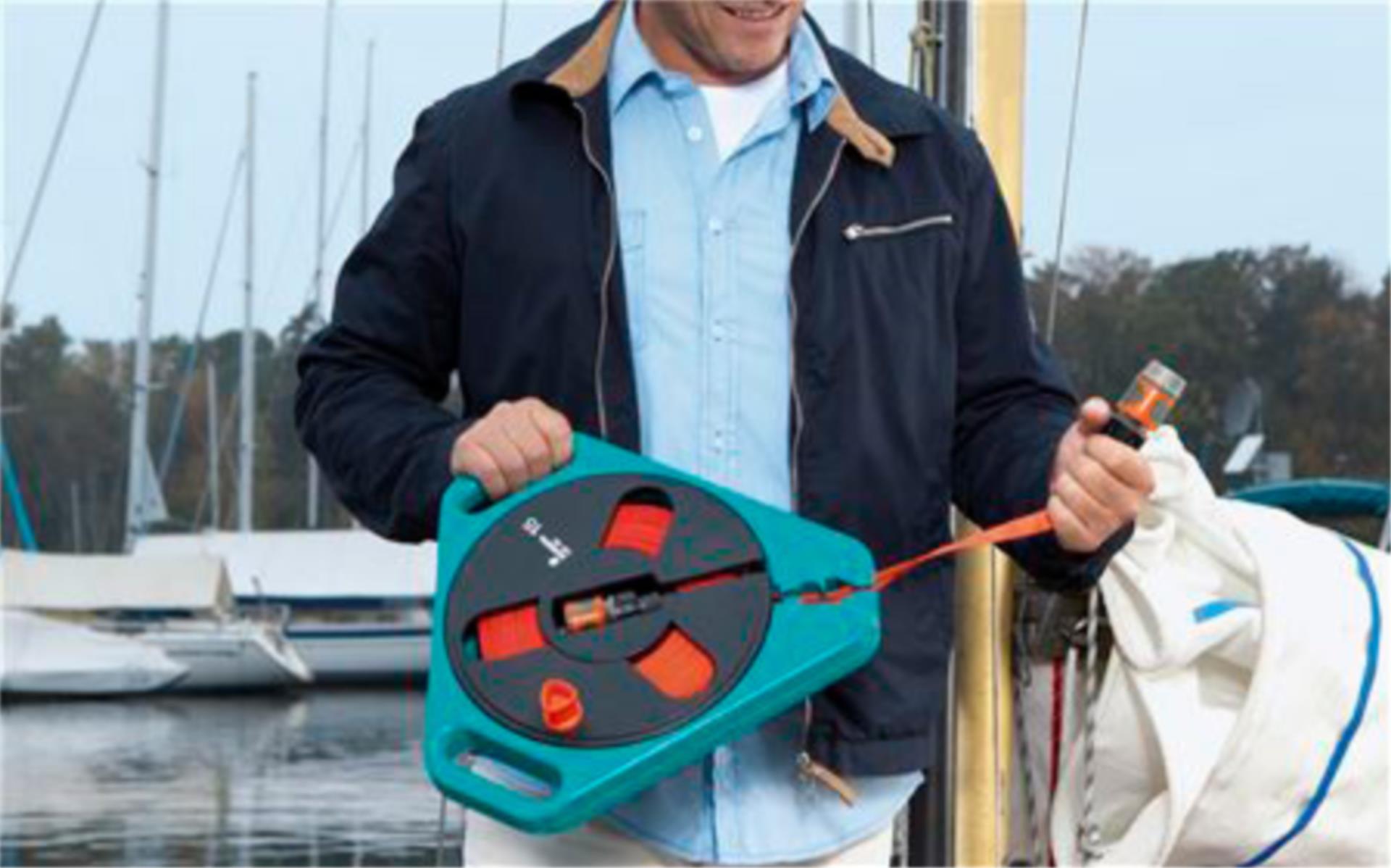 Der flache Schlauch lässt sich nach Gebrauch sauber in der Kassette aufrollen und beansprucht nur minimalen Stauraum. Damit ist dieses System besonders geeignet für Boote und Yachten mit begrenzten Staufächern. Die integrierten Schnellkupplungen im Gardena-Standard ermöglichen einen schnellen Anschluss sowie ein unkompliziertes Trennen – ganz ohne Werkzeug und ohne lästiges Verknoten oder Verheddern des Schlauchs.