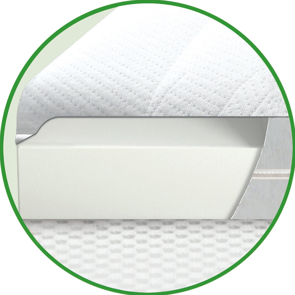 Der Bezug besteht aus einem gisamed® Doppeltuch mit antiallergischer Klimafaser. Dieses Material ist atmungsaktiv, pflegeleicht und dauerhaft gegen Schimmelpilzbefall geschützt – ganz ohne Fungizide oder Mikrobiozide. Die Unterseite aus luftdurchlässigem DRYWEAVE® unterstützt die Luftzirkulation zusätzlich und verbessert das Schlafklima deutlich. Durch die effektive Unterlüftung kann in vielen Fällen auf einen Lattenrost verzichtet werden, wodurch mehr Raum und Höhe in der Kabine erhalten bleiben.