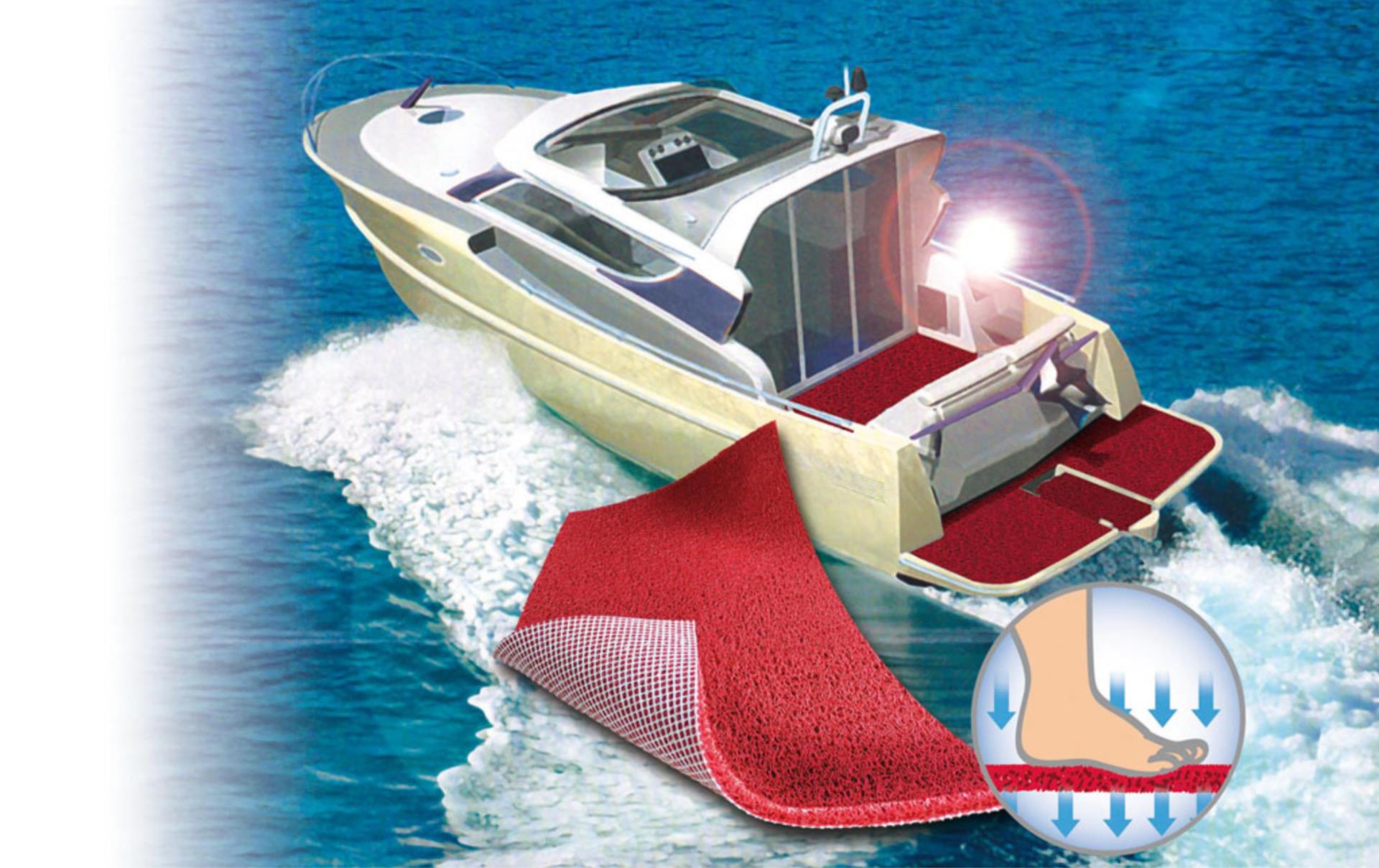 Dank seiner wasser- und lichtdurchlässigen Struktur kann Regen- oder Spritzwasser problemlos ablaufen. Gleichzeitig trocknet der Teppich schnell und bleibt auch bei feuchter Witterung rutschfest. Das integrierte Anti-Rutsch-Netz auf der Unterseite sorgt für sicheren Halt auf verschiedenen Untergründen wie GFK, Holz oder Metall. Dadurch eignet sich der Teppich ideal für Cockpit, Badeplattform oder Laufdecks.
