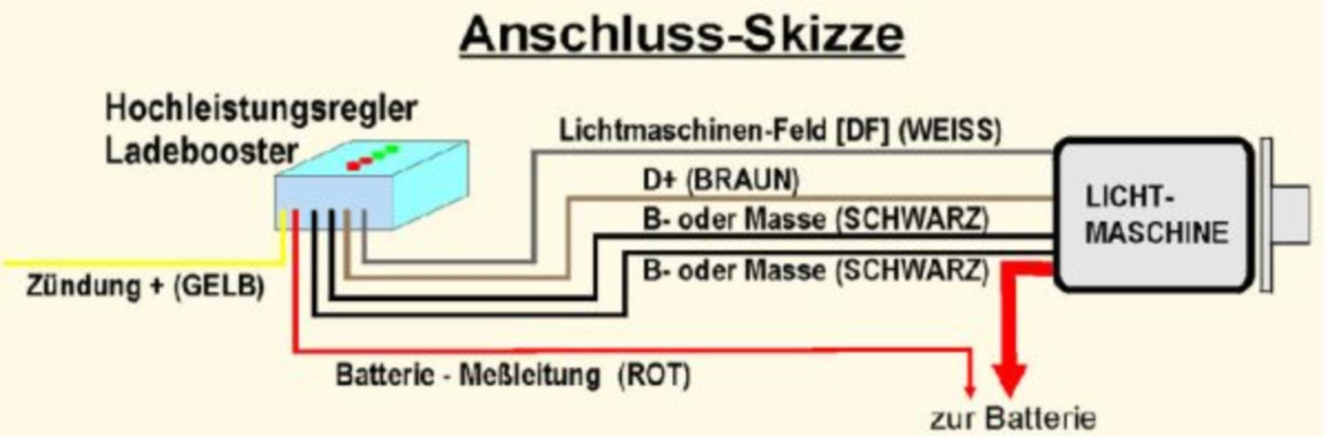 - Standardregler der Lichtmaschine muss nicht ausgebaut werden und dient als zusätzliches Not-Ladesystem,