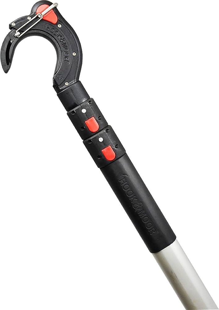 Darüber hinaus kann der Hook & Moor wie ein herkömmlicher Bootshaken verwendet werden, indem der Hakenkopf verriegelt wird. Mit seiner Teleskopfunktion lässt sich der Hook & Moor von 115 cm auf beeindruckende 320 cm verlängern. Gefertigt aus hochwertigem, kohlefaserverstärktem Polyamid, geschmiedetem Aluminium und rostfreiem Stahl, bietet er nicht nur Innovation, sondern auch Langlebigkeit.