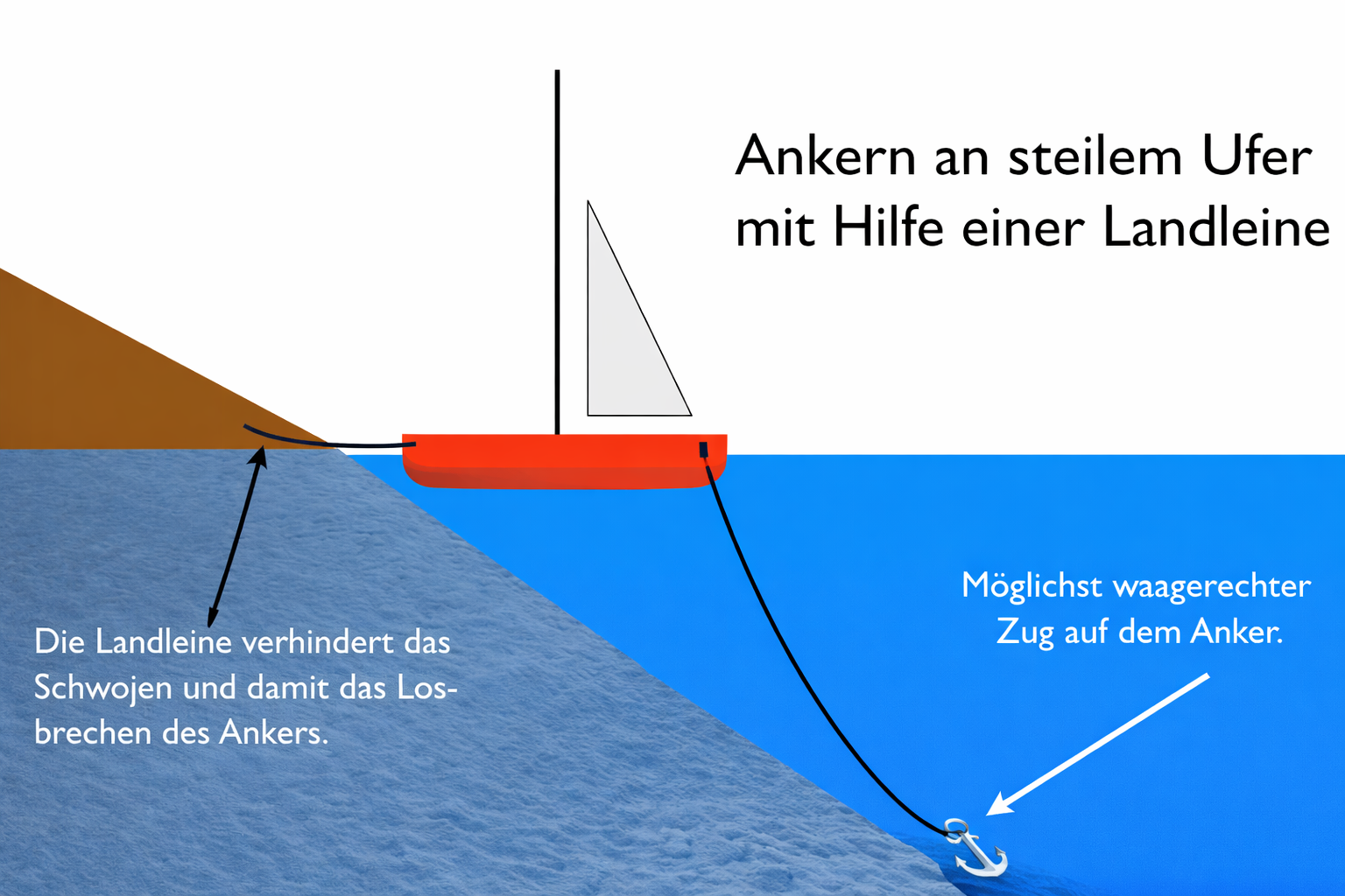 Ankern bei auflandigem Wind: Die Leine hilft, das Schiff vom Ufer fernzuhalten, während der Anker vorne (in tieferem Wasser) hält.