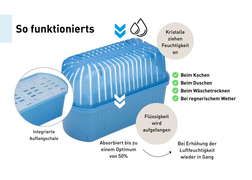 - ✔ Wirkt ab ca. 50 % Luftfeuchtigkeit – ganz ohne Strom