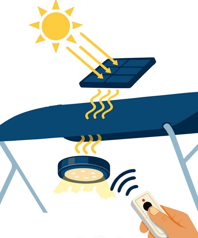 Dank induktiver Energieübertragung durch Textilien wird die Solarenergie direkt durch Biministoffe, Sprayhoods oder Sonnensegel geleitet. Das Solarpanel befindet sich oberhalb des Stoffes, die Leuchte darunter – sicher fixiert durch starke Magnete und jederzeit frei positionierbar. So entsteht Licht genau dort, wo es gebraucht wird.
