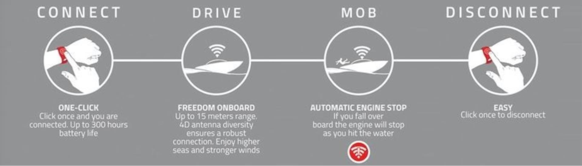 Dieses effiziente Sicherheitssystem schaltet den Motor automatisch aus, sobald der Sender (xFOB) mindestens 10 cm tief eintaucht oder mehr als 12 m vom Empfänger (xHUB) entfernt ist.