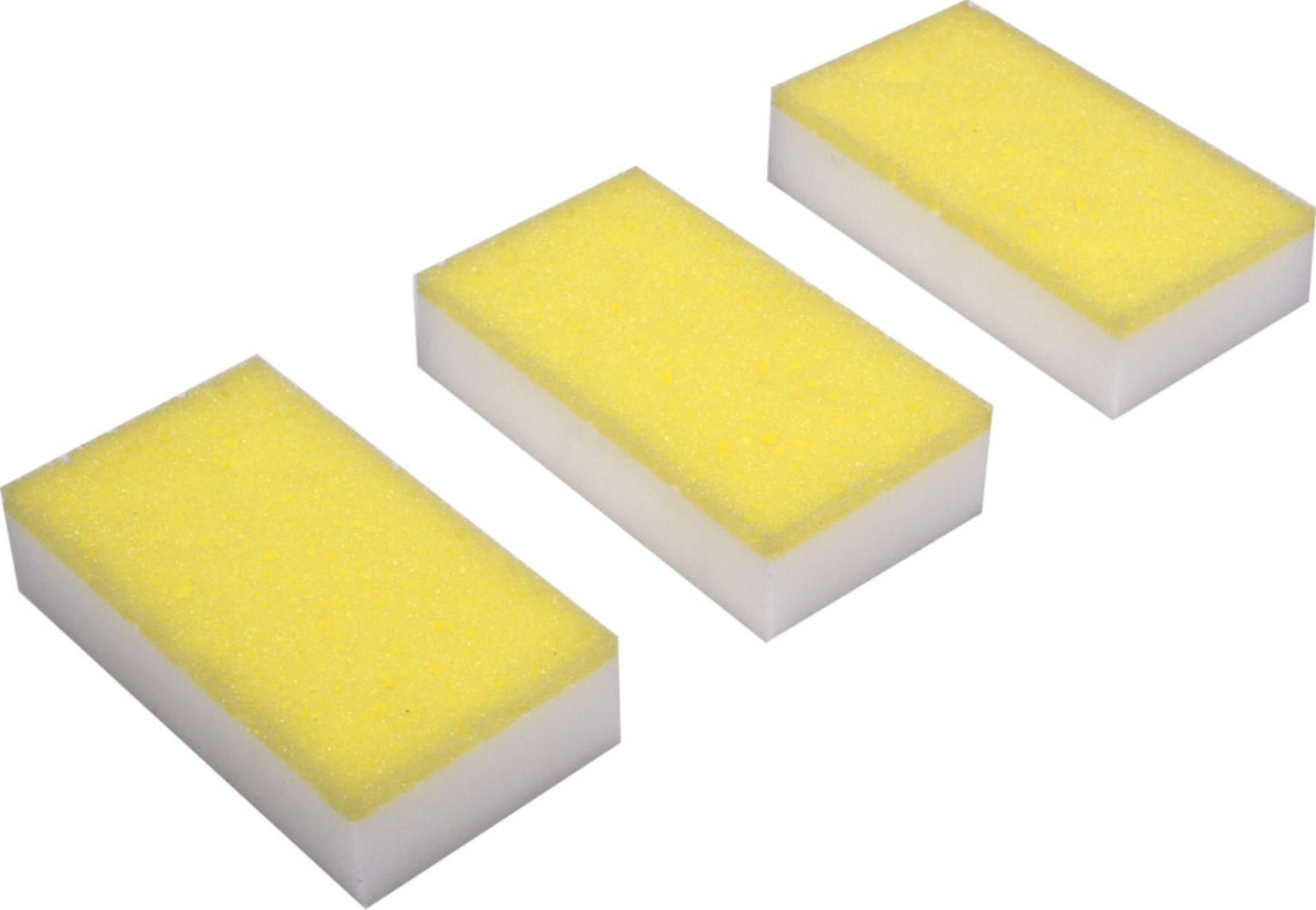 Der Schwamm funktioniert wie ein Radierer. Die weiße Seite nutzt sich bei Anwendung langsam ab. Empfindlichen Oberflächen, wie z.B. Lack, können matt werden.