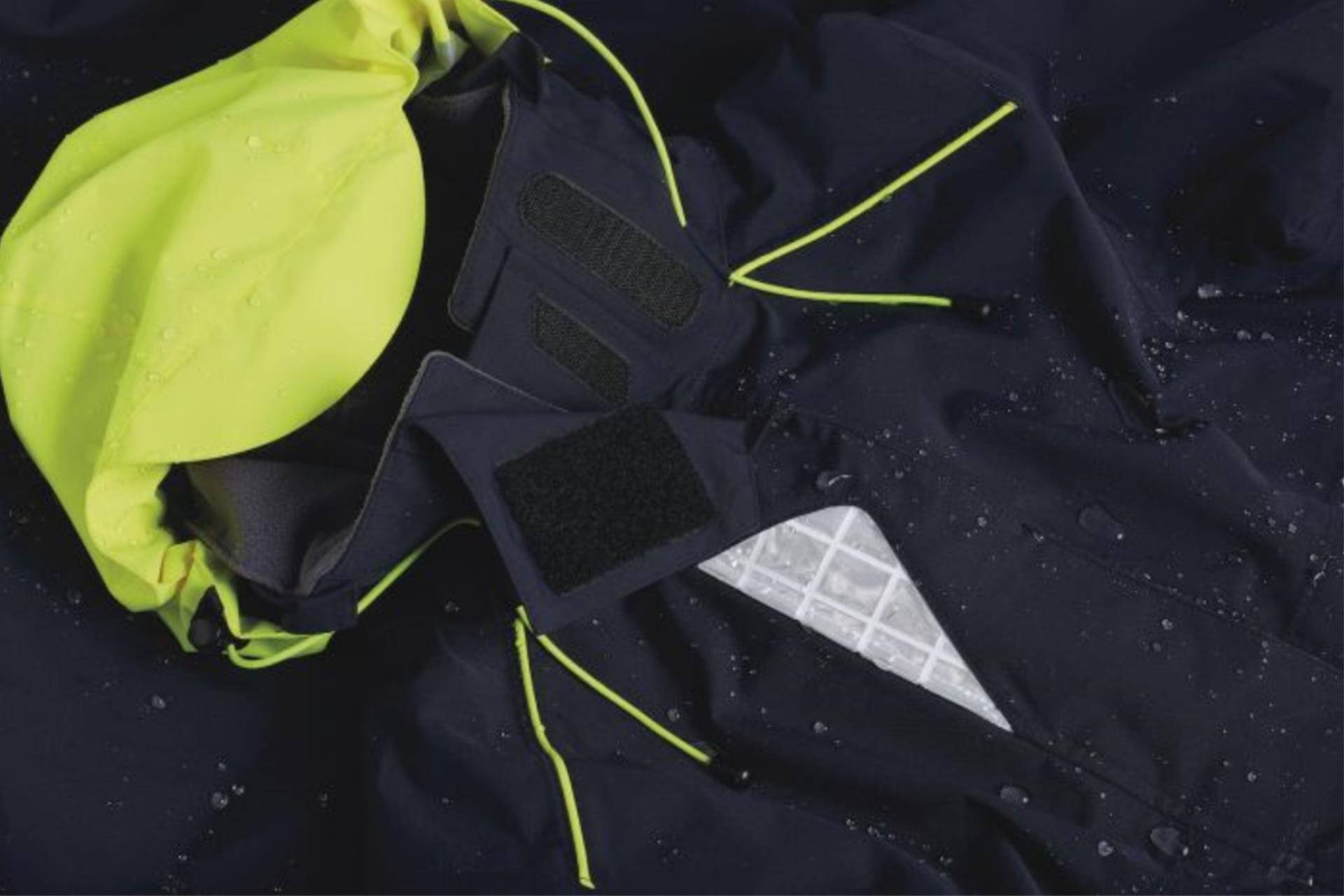 - Wasserdichte, winddichte und atmungsaktive Inshore-Jacke mit faltbarer Kapuze