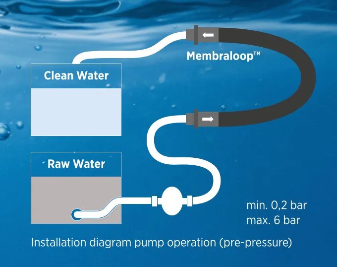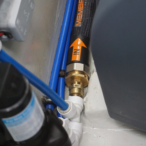 Membraloop® wird zwischen Druckwasserpumpe und Verbraucher (z. B. Wasserhahn/Dusche) in Ihr Trinkwassersystem integriert. Das Wasser wird durch Membranfasern gefiltert – Sie erhalten sauberes Reinwasser direkt am Hahn. Je nach Setup ist für die Betankung von außen sogar keine zusätzliche Pumpe nötig.