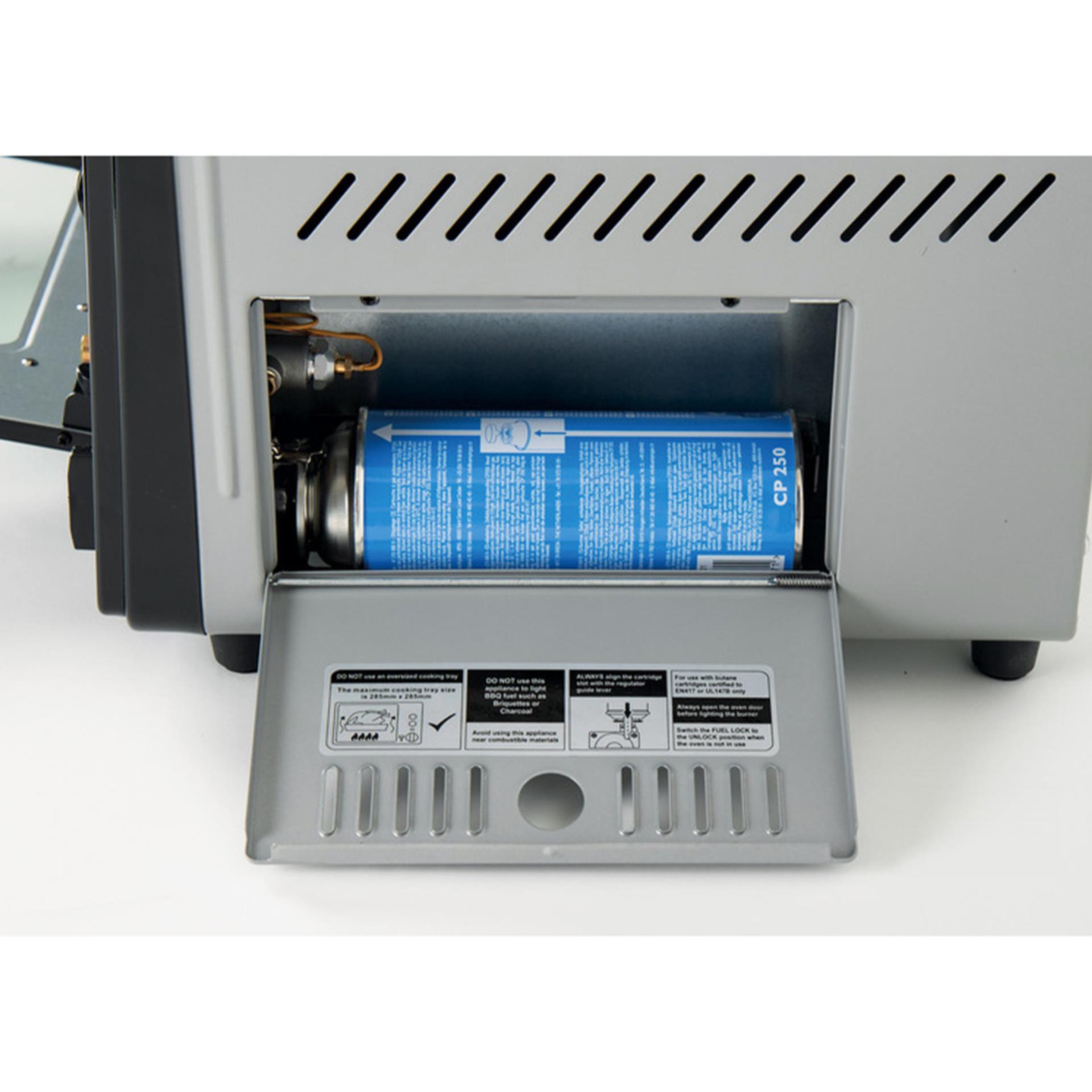 Für zusätzliche Sicherheit sorgen eine Zündsicherung, ein integrierter Kartuschenschutz sowie eine Ofentür aus Sicherheitsglas, die eine optimale Kontrolle des Garvorgangs ermöglicht. Die Bedienung ist unkompliziert und schnell erlernt, sodass Sie jederzeit frische Speisen zubereiten können – auch fernab von Küche oder Hafen.