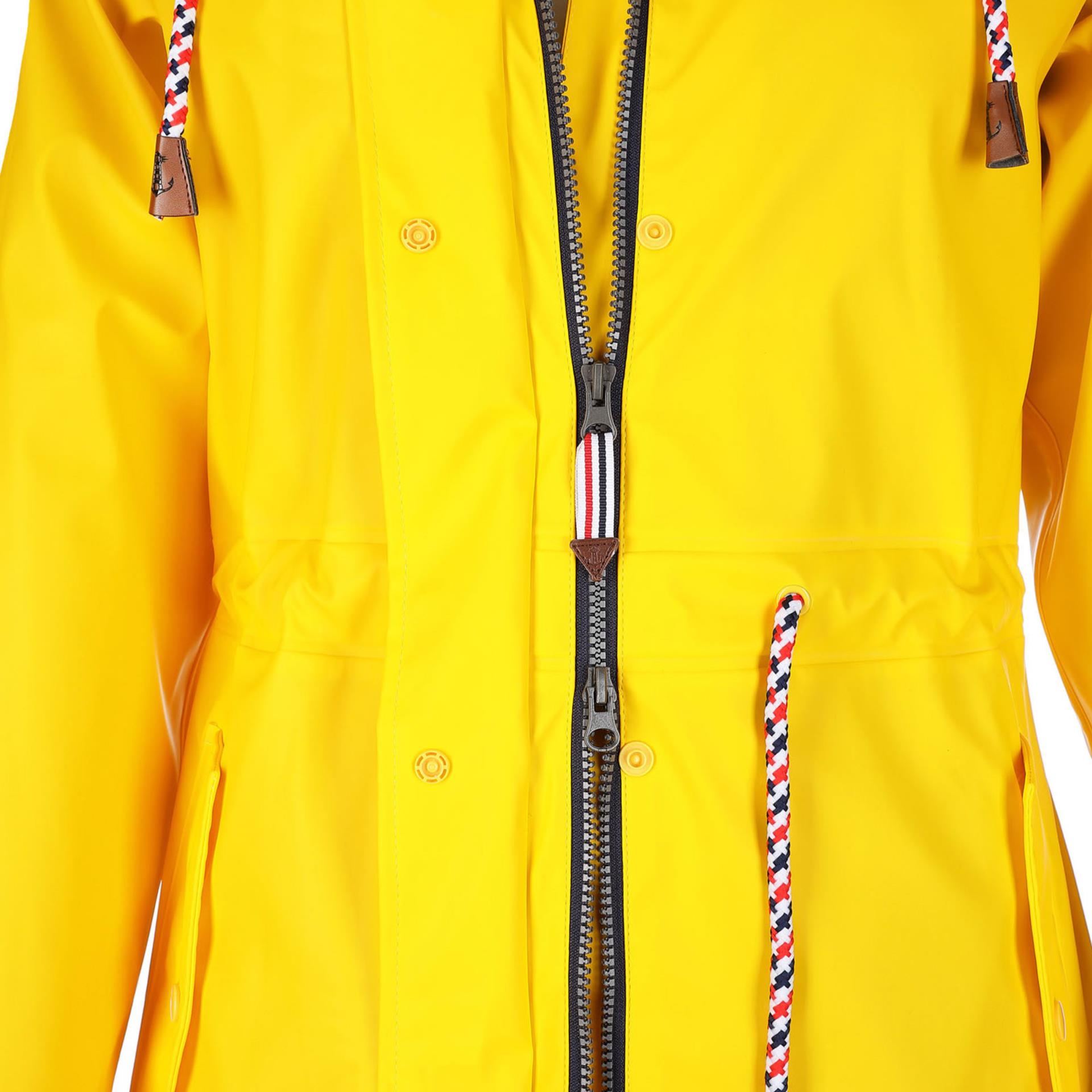 Die Modas Damen PU-Regenjacke kombiniert funktionale Wetterfestigkeit mit modischem Design – perfekt für den Einsatz an Bord, beim Spaziergang im Hafen oder im Alltag. Die taillierte Passform schmeichelt der Figur, während das verlängerte Rückenteil zusätzlichen Schutz bietet. Die Kordel-Applikation setzt einen dezenten maritimen Akzent und sorgt gleichzeitig für optimalen Sitz.