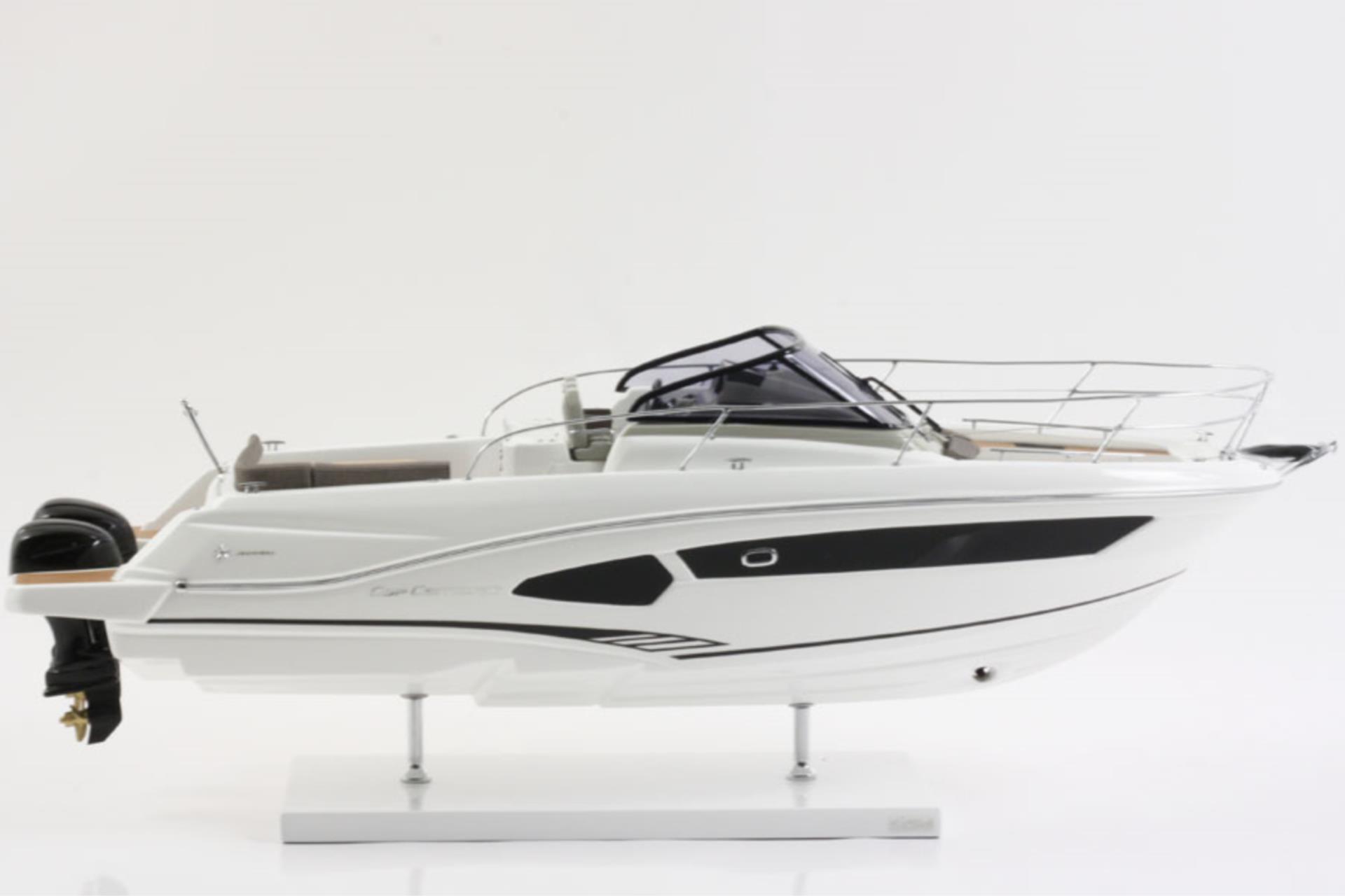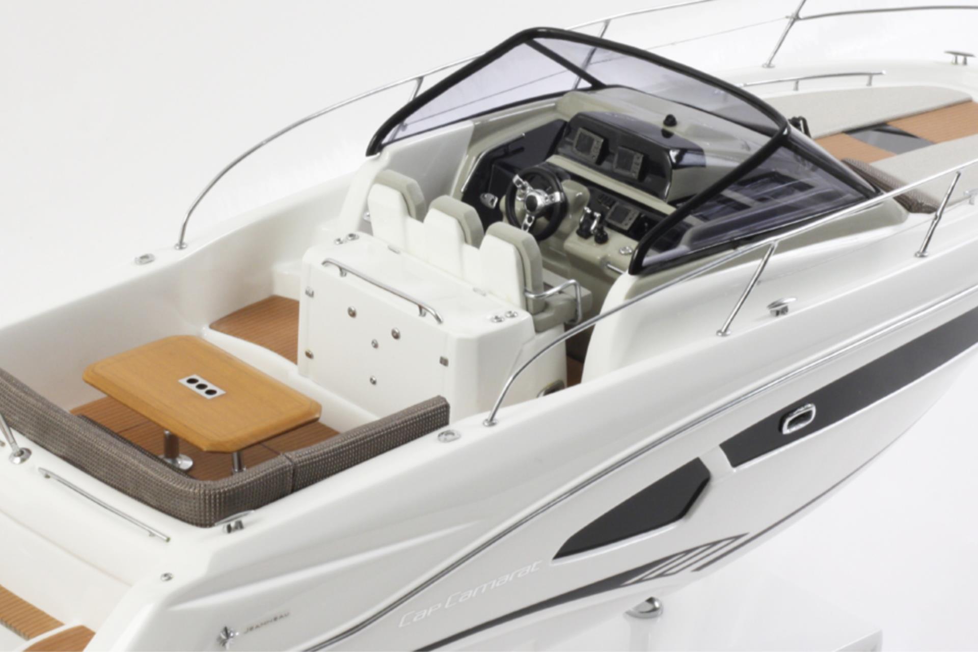 Massstabsgeträuer Nachbau der Jeanneau Cap Camarat 10.5 WA. Dieses Modell, Massstab 1:20, wird in Partnerschaft mit der Jeanneau Werft nach den original Plänen nachgebaut. Die Decksausrüstungen bestehen aus verchromtem Messing. Das Lattenrost und Holzdeck ist feinste Massarbeit. Es wurden 4 Farbschichten und 2 Schichten Lack aufgetragen.