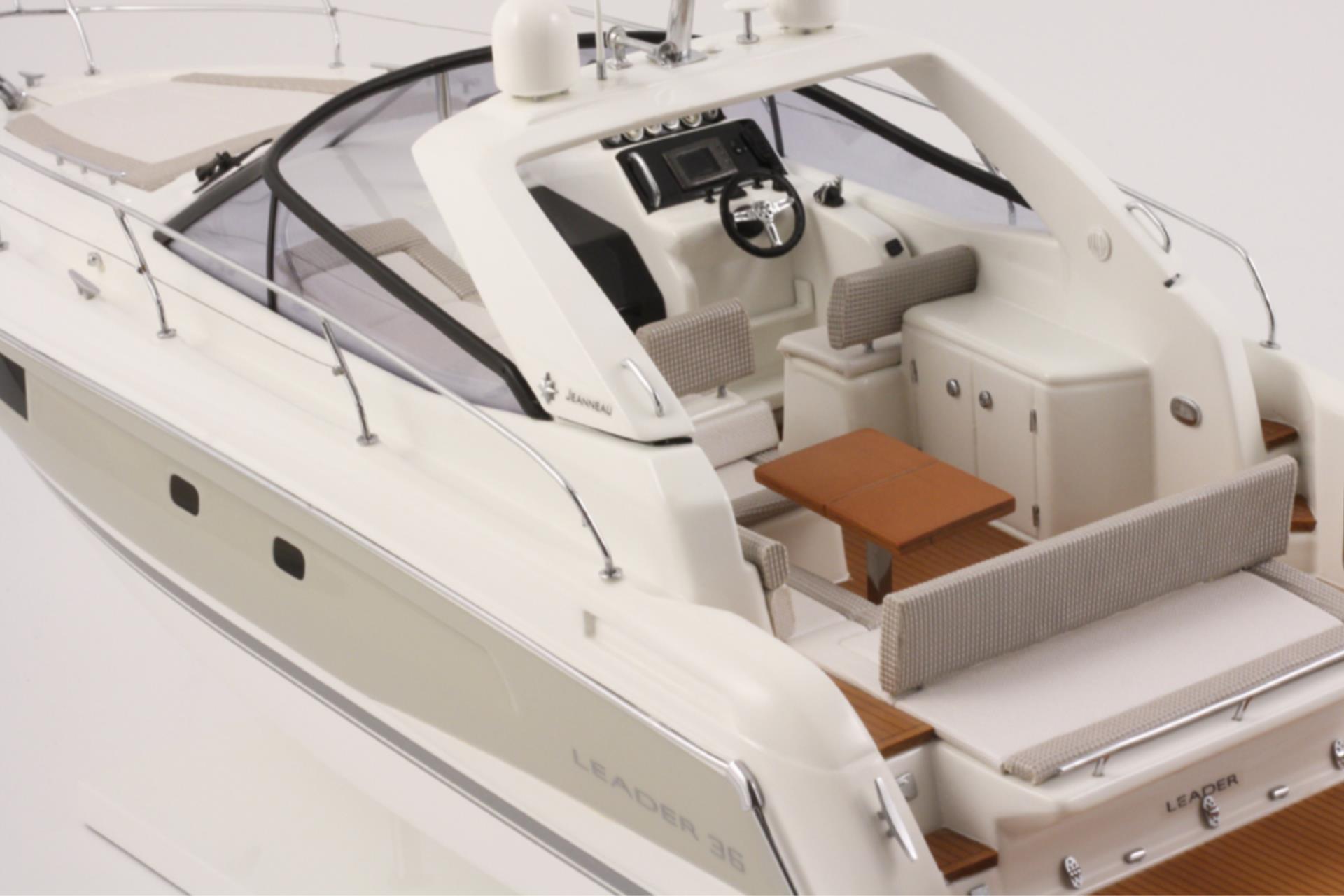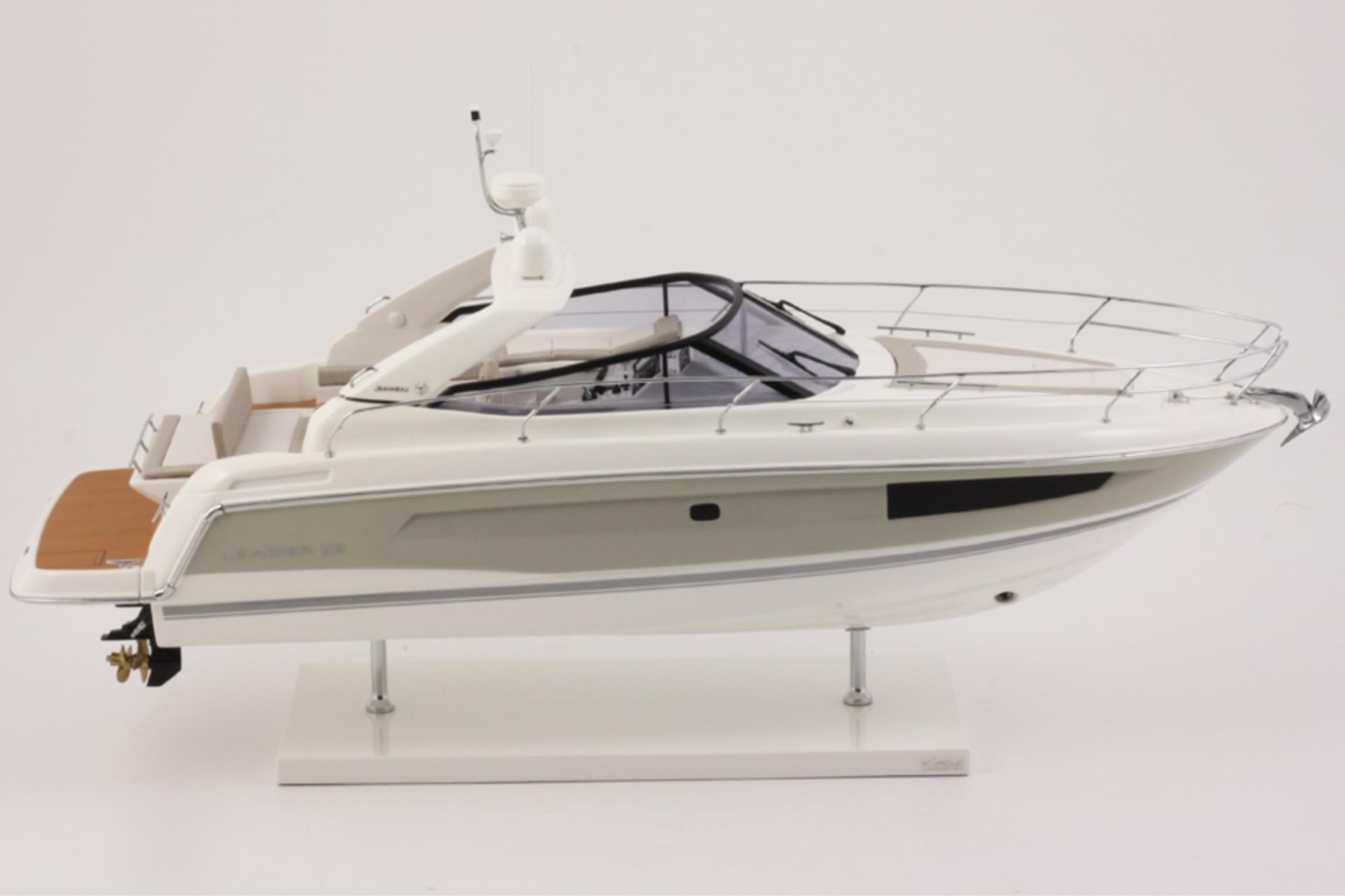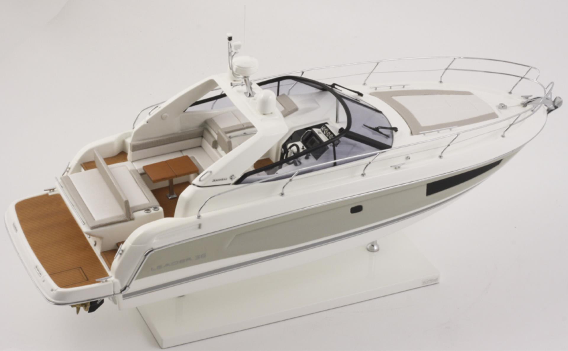 Massstabsgeträuer Nachbau der Jeanneau Leader 36 Open. Dieses Modell, Massstab 1:20, wird in Partnerschaft mit der Jeanneau Werft nach den original Plänen nachgebaut. Die Decksausrüstungen bestehen aus verchromtem Messing. Das Lattenrost und Holzdeck ist feinste Massarbeit. Es wurden 4 Farbschichten und 2 Schichten Lack aufgetragen.