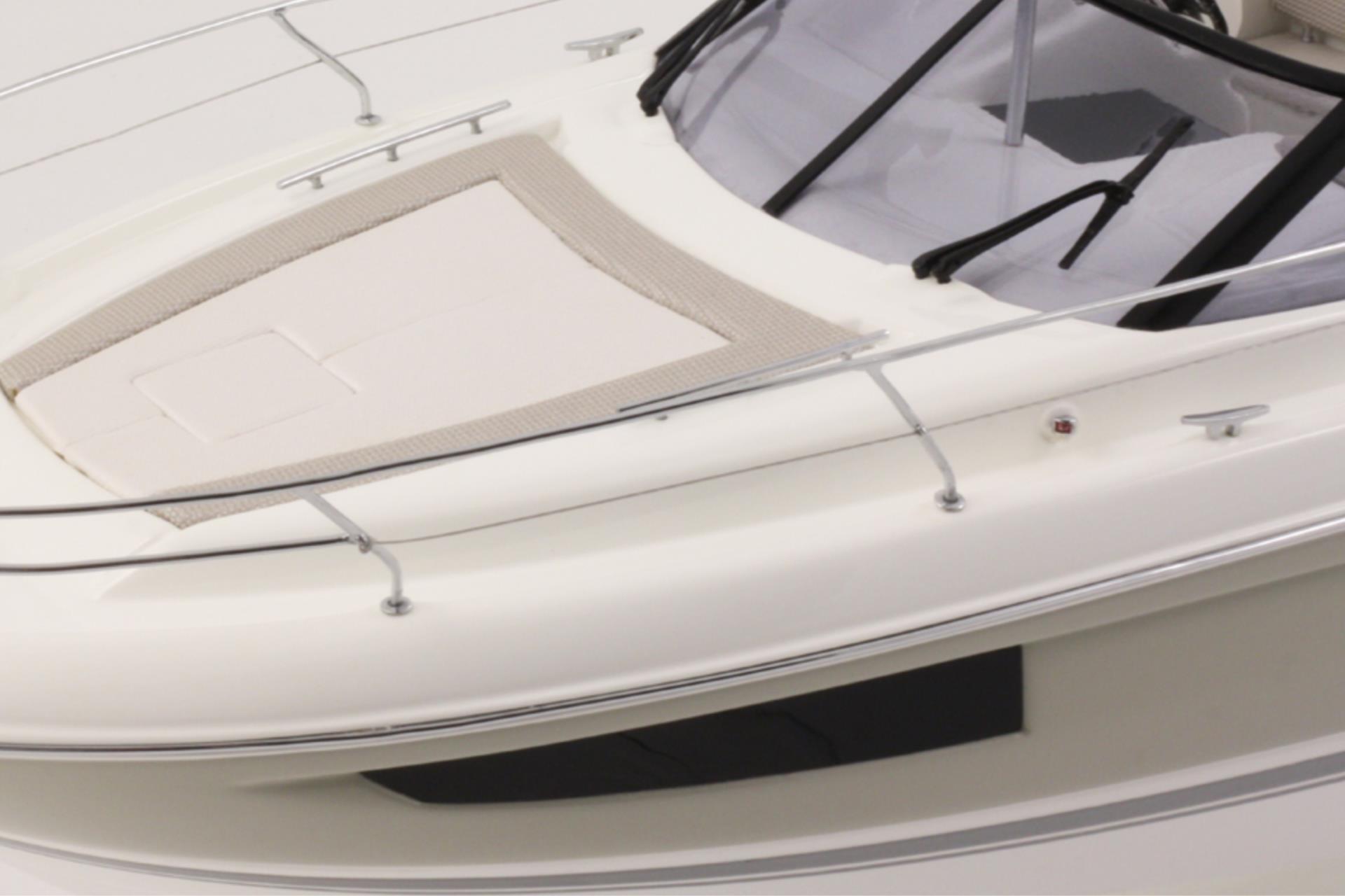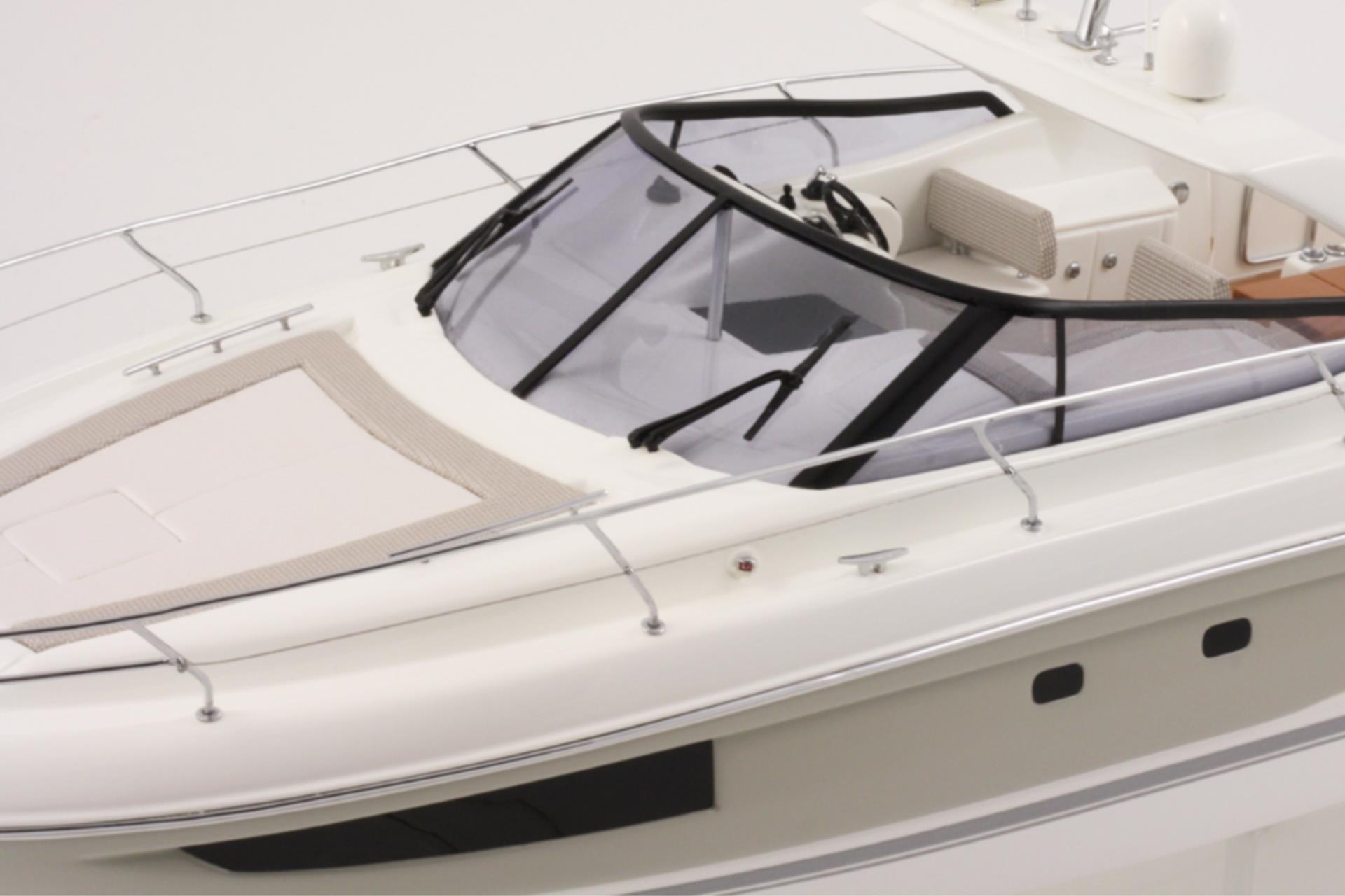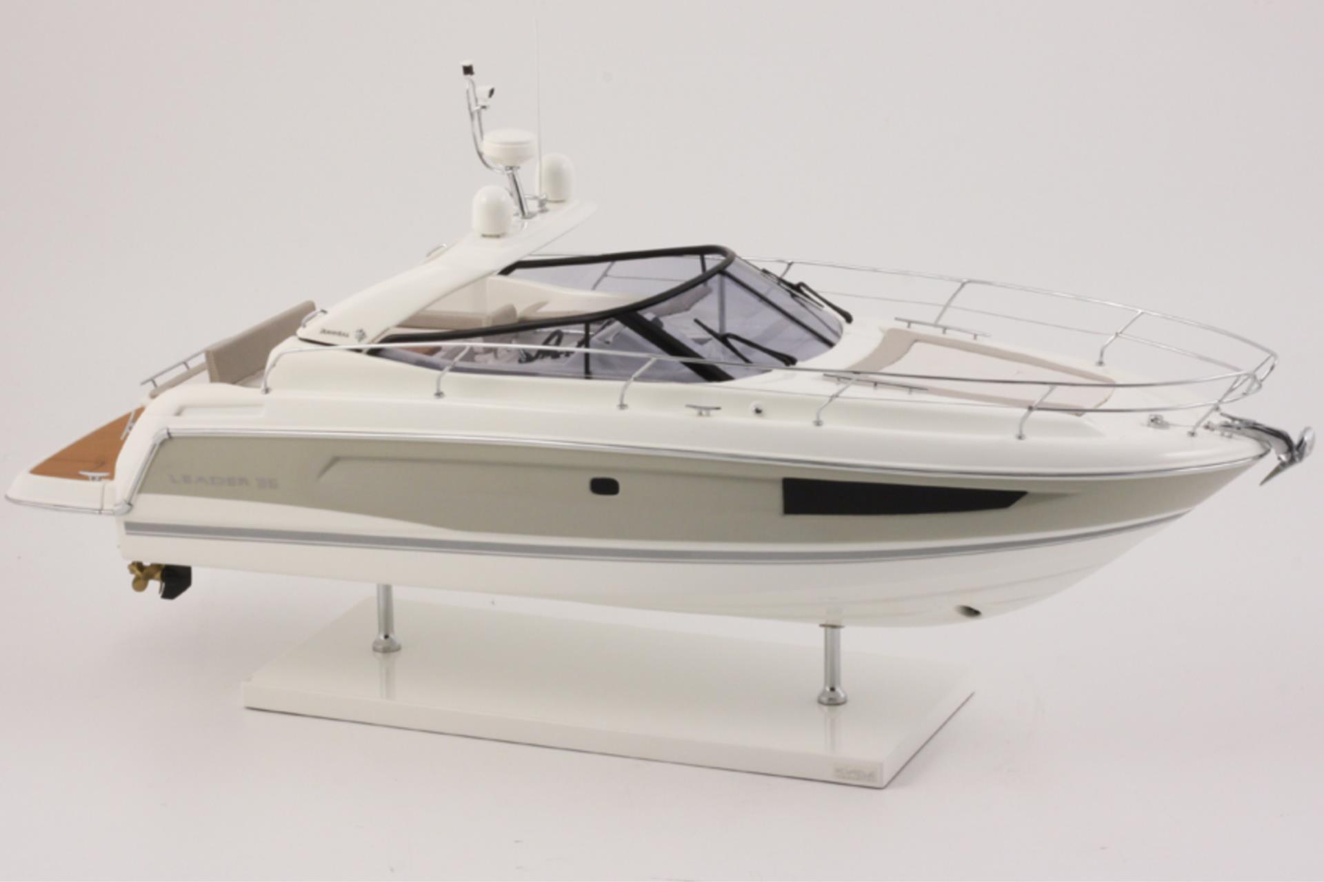 Massstabsgeträuer Nachbau der Jeanneau Leader 36 Open. Dieses Modell, Massstab 1:20, wird in Partnerschaft mit der Jeanneau Werft nach den original Plänen nachgebaut. Die Decksausrüstungen bestehen aus verchromtem Messing. Das Lattenrost und Holzdeck ist feinste Massarbeit. Es wurden 4 Farbschichten und 2 Schichten Lack aufgetragen.