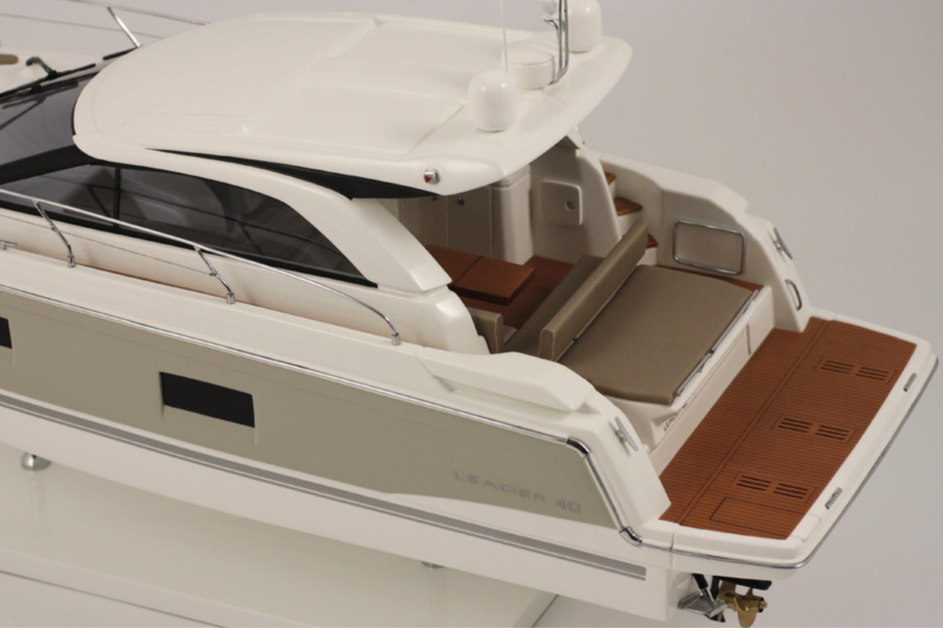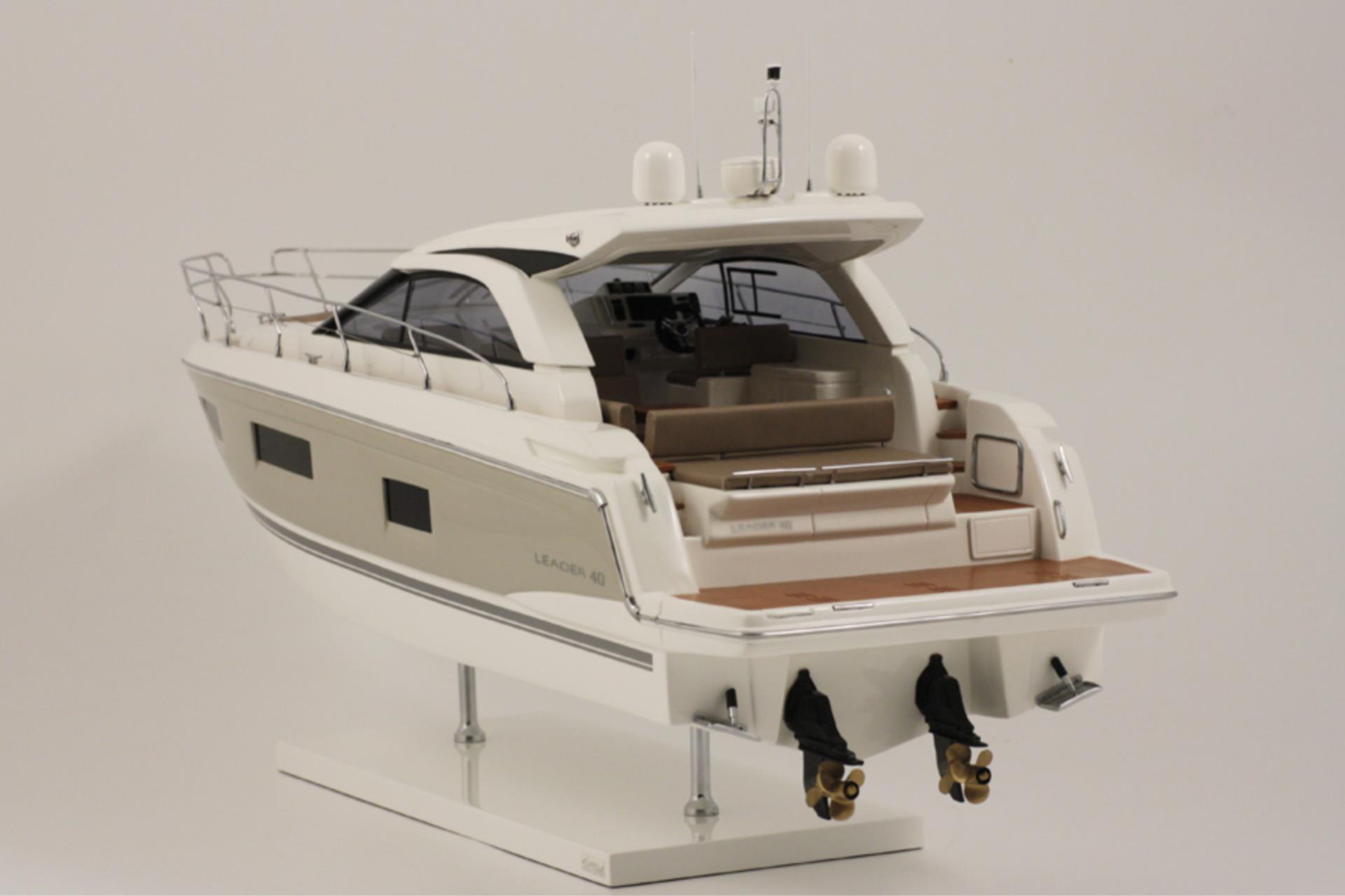 Massstabsgeträuer Nachbau der Jeanneau Leader 40 Sport Top. Dieses Modell, Massstab 1:20, wird in Partnerschaft mit der Jeanneau Werft nach den original Plänen nachgebaut. Die Decksausrüstungen bestehen aus verchromtem Messing. Das Lattenrost und Holzdeck ist feinste Massarbeit. Es wurden 4 Farbschichten und 2 Schichten Lack aufgetragen.