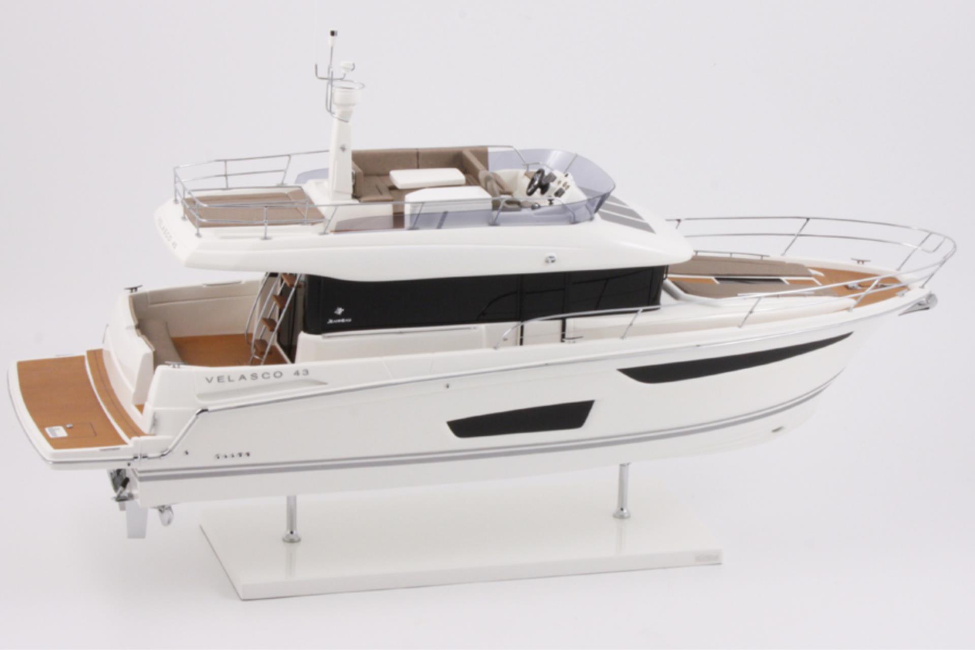 Das Modellschiff Jeanneau Velasco 43 ist ein außergewöhnlich hochwertiger, maßstabsgetreuer Nachbau einer der bekanntesten Motoryachten aus dem Hause Jeanneau. Dieses exklusive Schiffsmodell wird in enger Partnerschaft mit der Jeanneau Werft gefertigt und basiert auf den originalen Konstruktionsplänen des Herstellers.