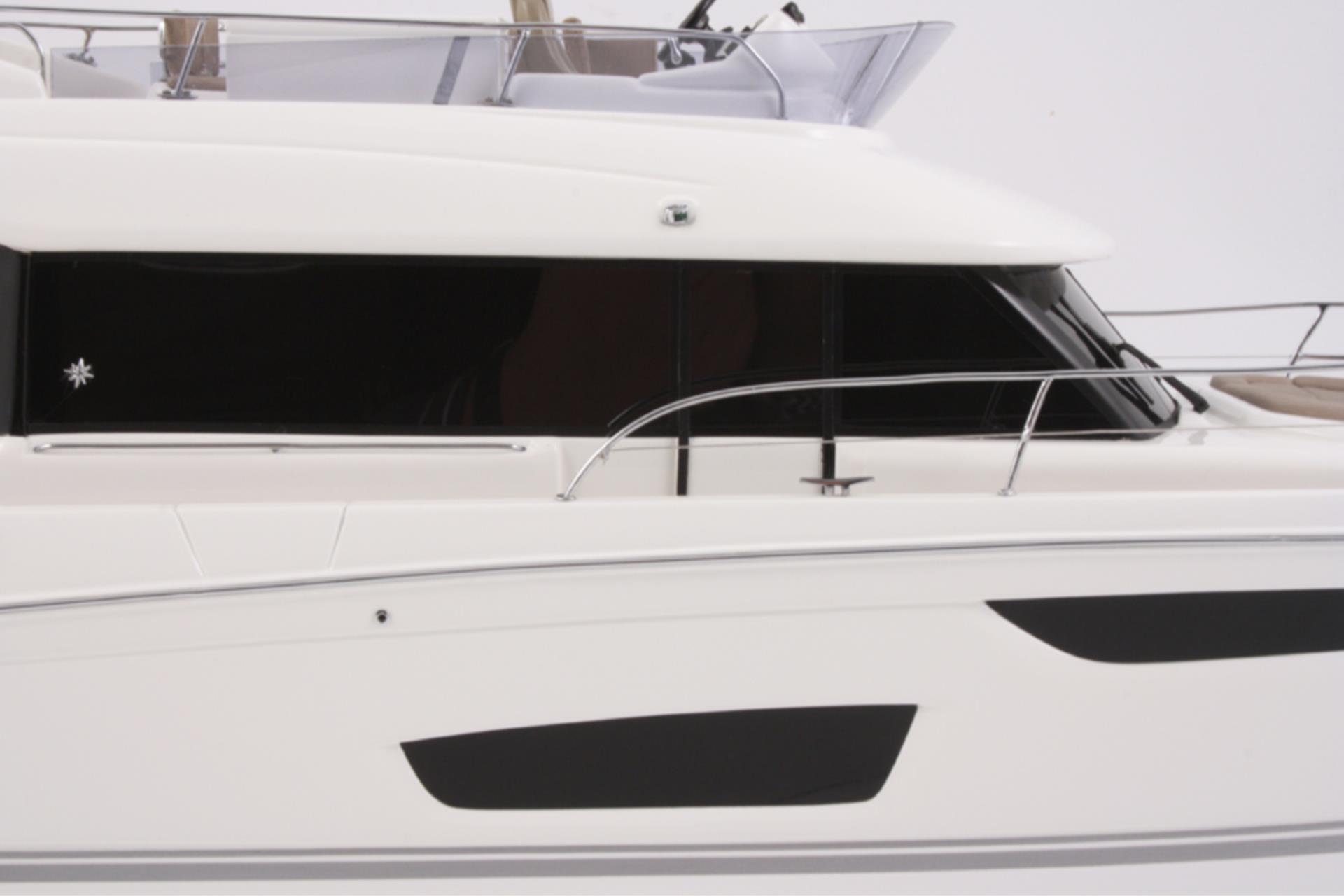 Massstabsgeträuer Nachbau der Jeanneau Velasco 43F. Dieses Modell, Massstab 1:20, wird in Partnerschaft mit der Jeanneau Werft nach den original Plänen nachgebaut. Die Decksausrüstungen bestehen aus verchromtem Messing. Das Lattenrost und Holzdeck ist feinste Massarbeit. Es wurden 4 Farbschichten und 2 Schichten Lack aufgetragen.