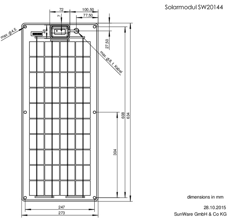 Das Solarmodul SW 20144 wurde speziell für kleine Solarsysteme konzipiert. Mit einer Leistung von 22 Watt-Peak (Wp) ist es optimal für 12V-Systeme ausgelegt, kann jedoch durch Reihenschaltung auch in 24V-Systemen verwendet werden. Je nach Sonneneinstrahlung liefert das Modul einen Ladestrom von bis zu 1,1 Ampere.