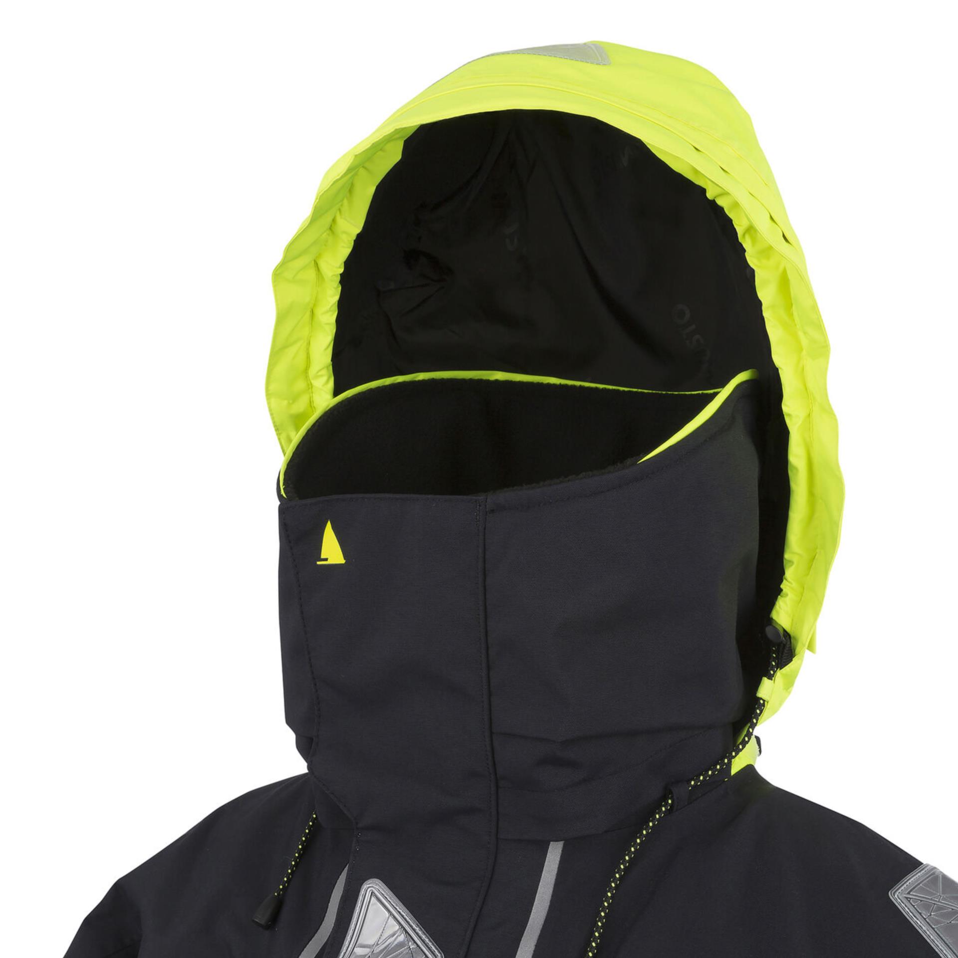 Innovative Kapuze und hoher Kragen: Eine neue neongelbe, anpassbare und verstaubare Kapuze, die in Höhe, Volumen und Breite eingestellt werden kann, bietet höchste Flexibilität. Der hoch geschnittene Kragen, gefüttert mit Fleece und verstaubarem Gischtschutz, bietet zusätzlichen Schutz und Komfort.