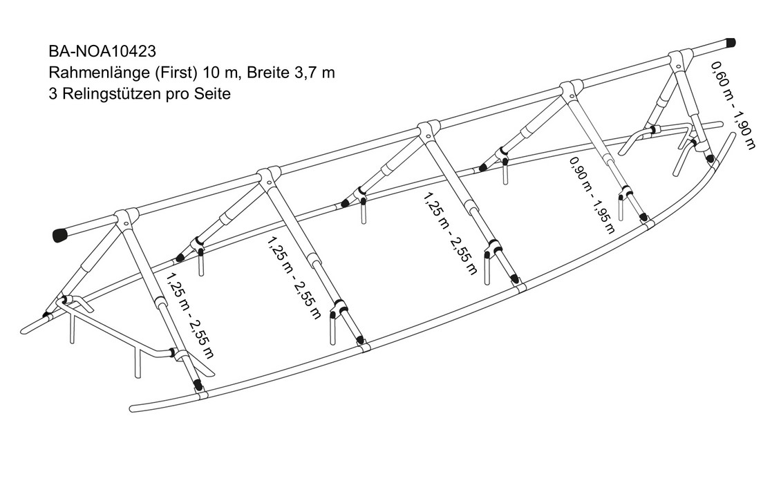 Wählen Sie das Gestell immer etwas länger als das Boot. Das Firstrohr sollte im Bug- oder Heckbereich nicht mehr als 30 cm überstehen, damit die Plane optimal sitzt.