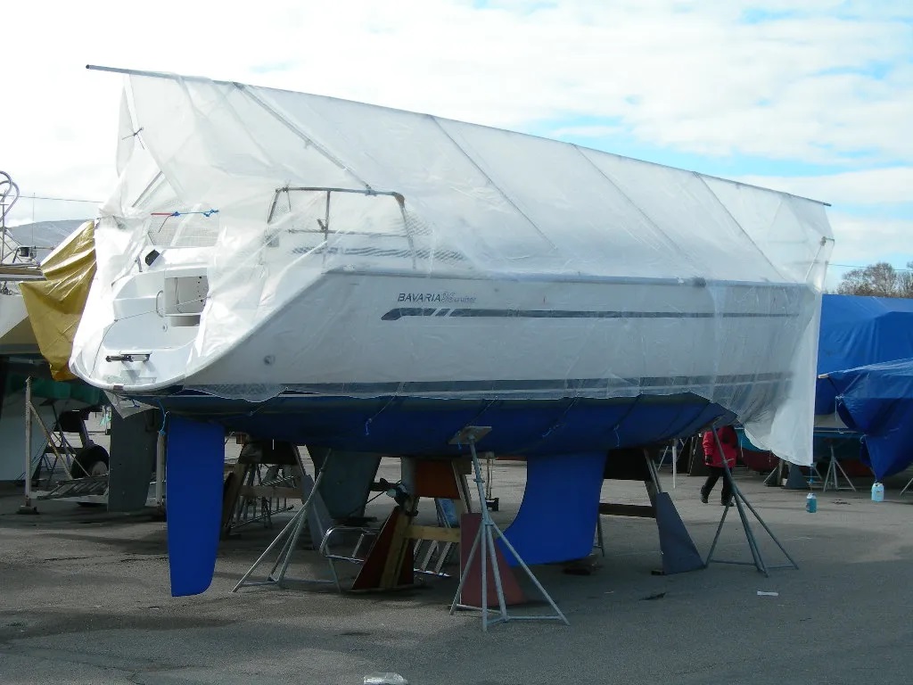 Durch die spezielle Überhang-Konstruktion entsteht zwischen Abdeckplane und Rumpf ein Luftpolster. Das sorgt für Belüftung und verhindert Feuchtigkeitsschäden sowie Scheuerstellen. Damit bleibt das Boot auch über lange Wintermonate bestmöglich geschützt.