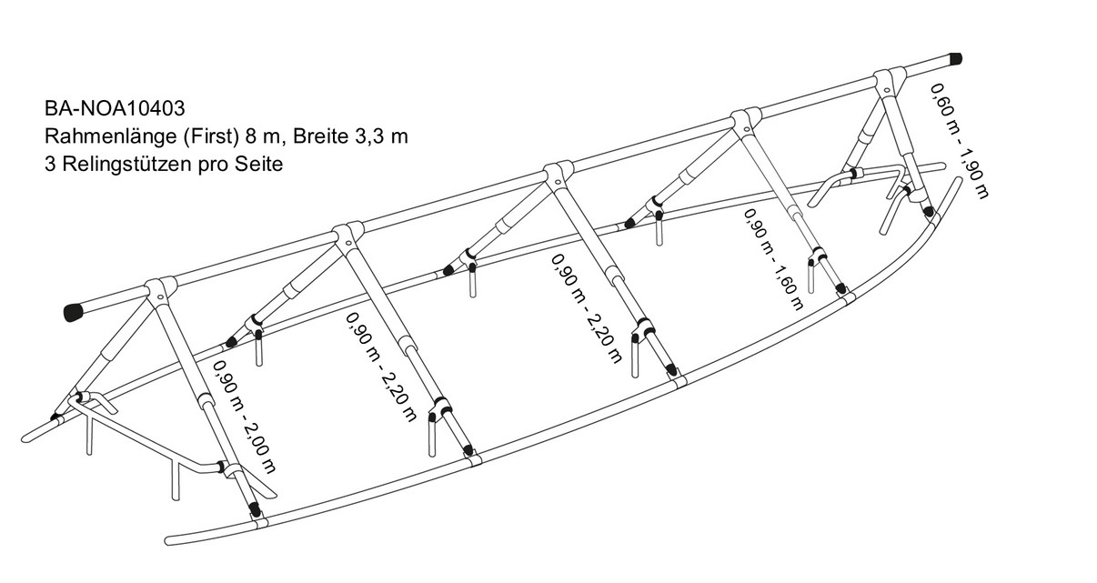 Wählen Sie das Gestell immer etwas länger als das Boot. Das Firstrohr sollte im Bug- oder Heckbereich nicht mehr als 30 cm überstehen, damit die Plane optimal sitzt.