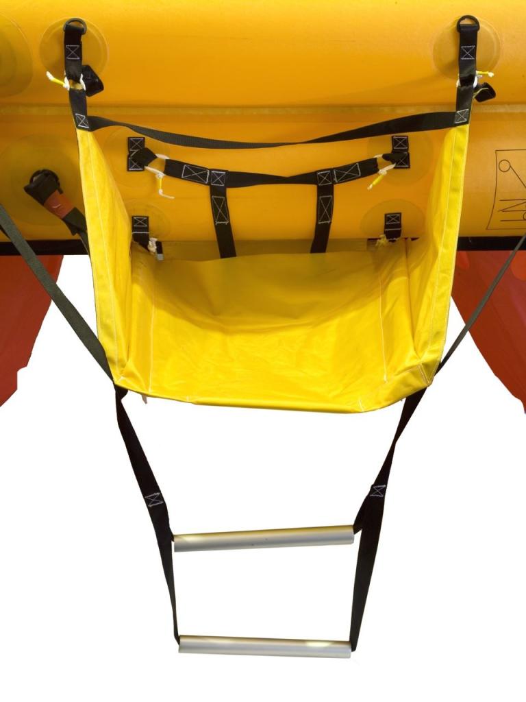 Die Auftriebskörper bestehen aus hochfestem, PU-beschichtetem Nylongewebe in langlebiger Sandwichbauweise. Diese Konstruktion gewährleistet hohe Widerstandsfähigkeit und lange Lebensdauer auch bei intensiver Nutzung im Offshore-Bereich. Große Kenterschutzsäcke sorgen für Stabilität bei rauer See, während die großzügige Einstiegshilfe mit Rampe ein sicheres Boarding ermöglicht.