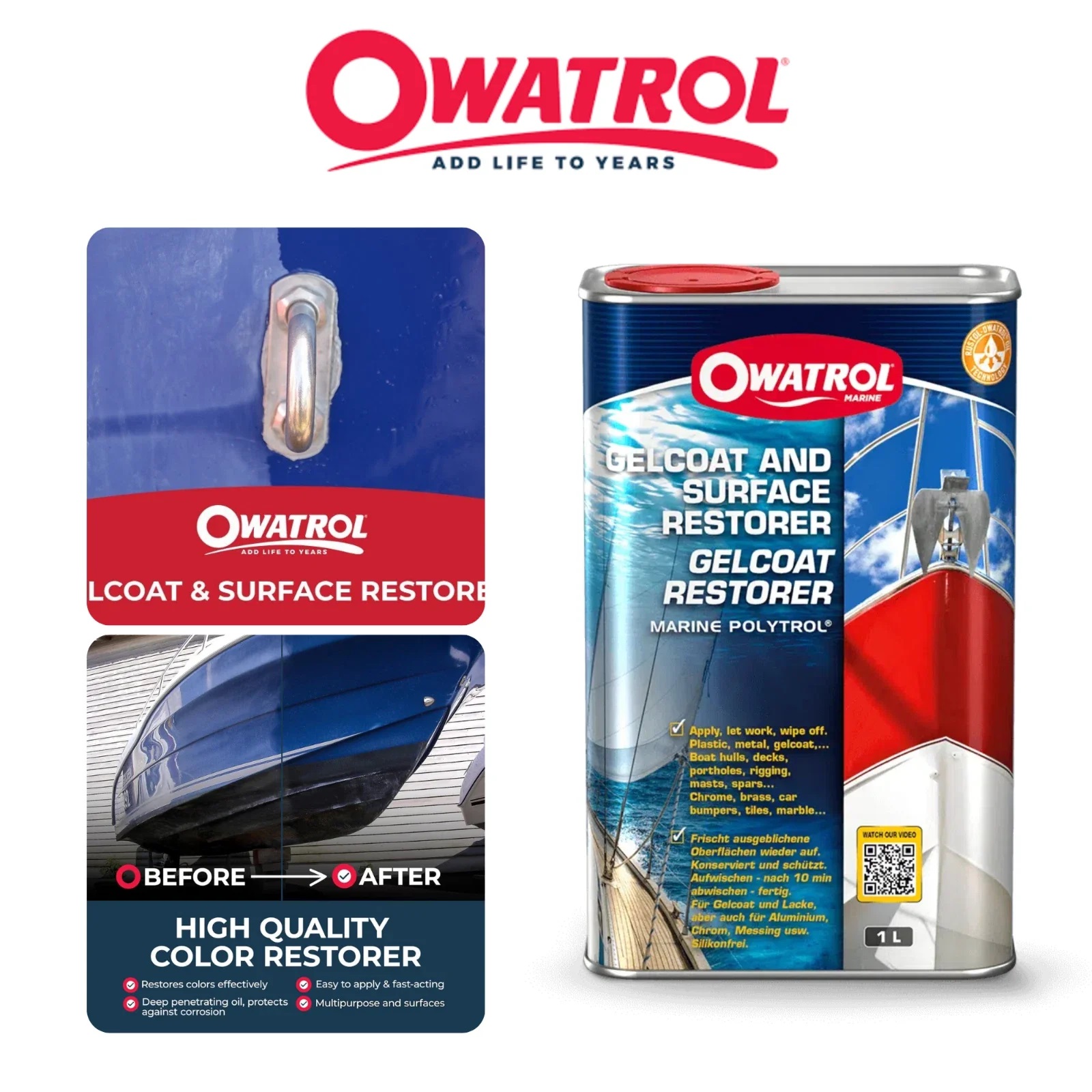 Der Owatrol Polytrol Gelcoat Restorer bringt verblasste und matte Oberflächen wieder zum Strahlen! Speziell entwickelt für Gelcoats, Fiberglas (GRP) und viele weitere Materialien, dringt er tief in die Oberfläche ein und stellt die ursprüngliche Farbe wieder her. UV-Strahlung, Regen und Verschmutzung setzen Booten und Oberflächen zu – mit Polytrol erstrahlen sie wieder in neuem Glanz.