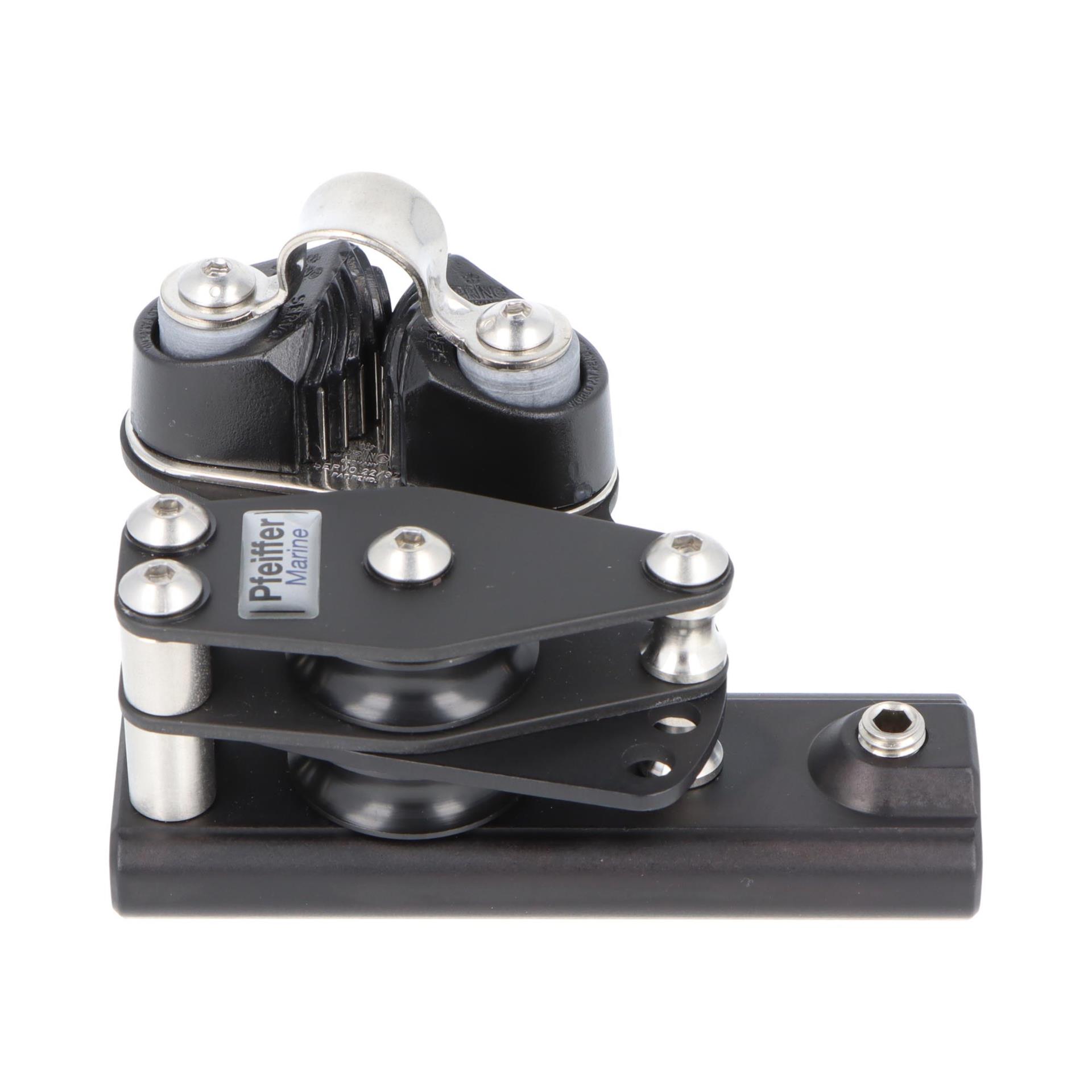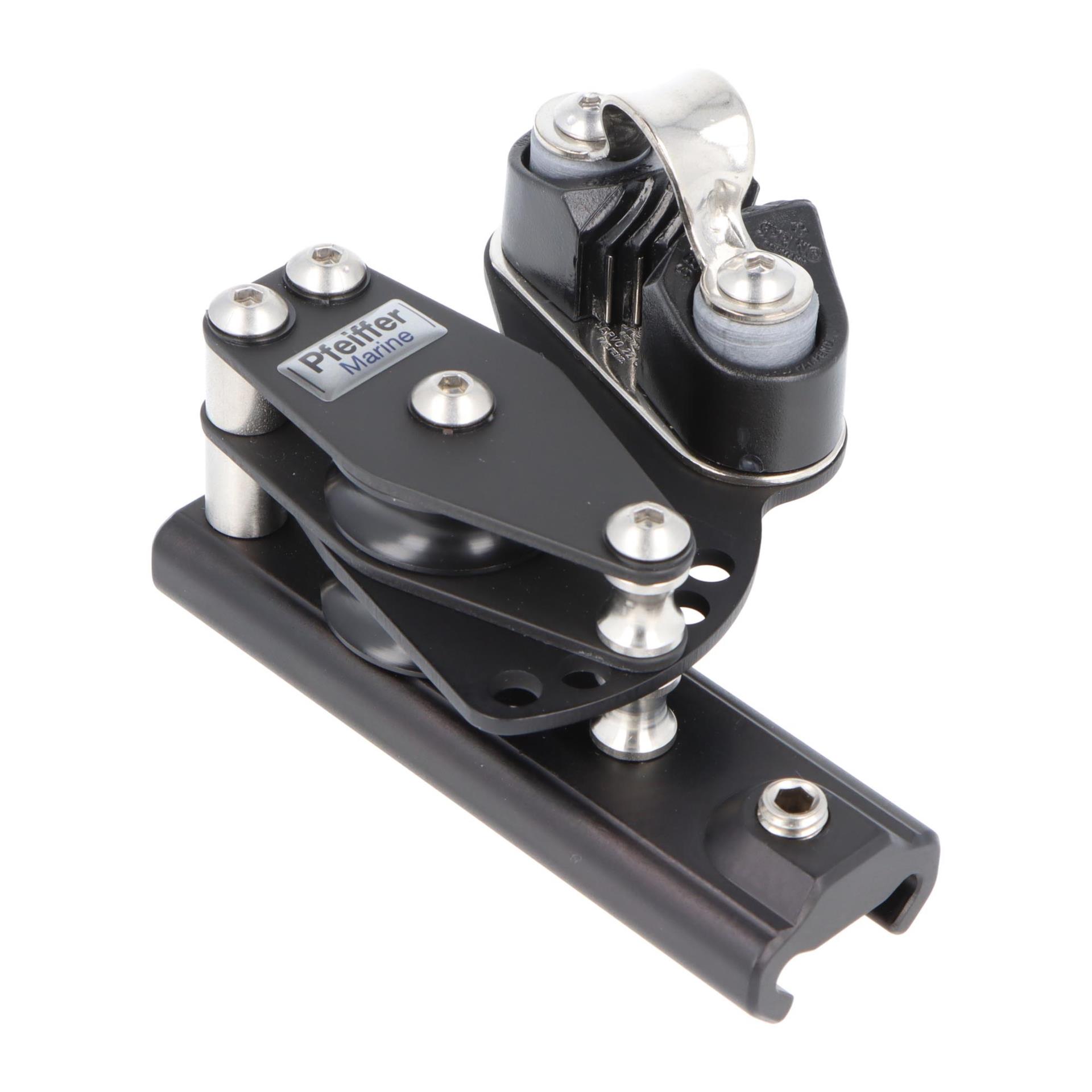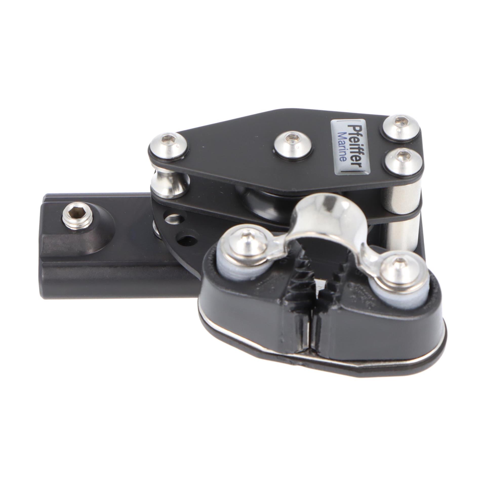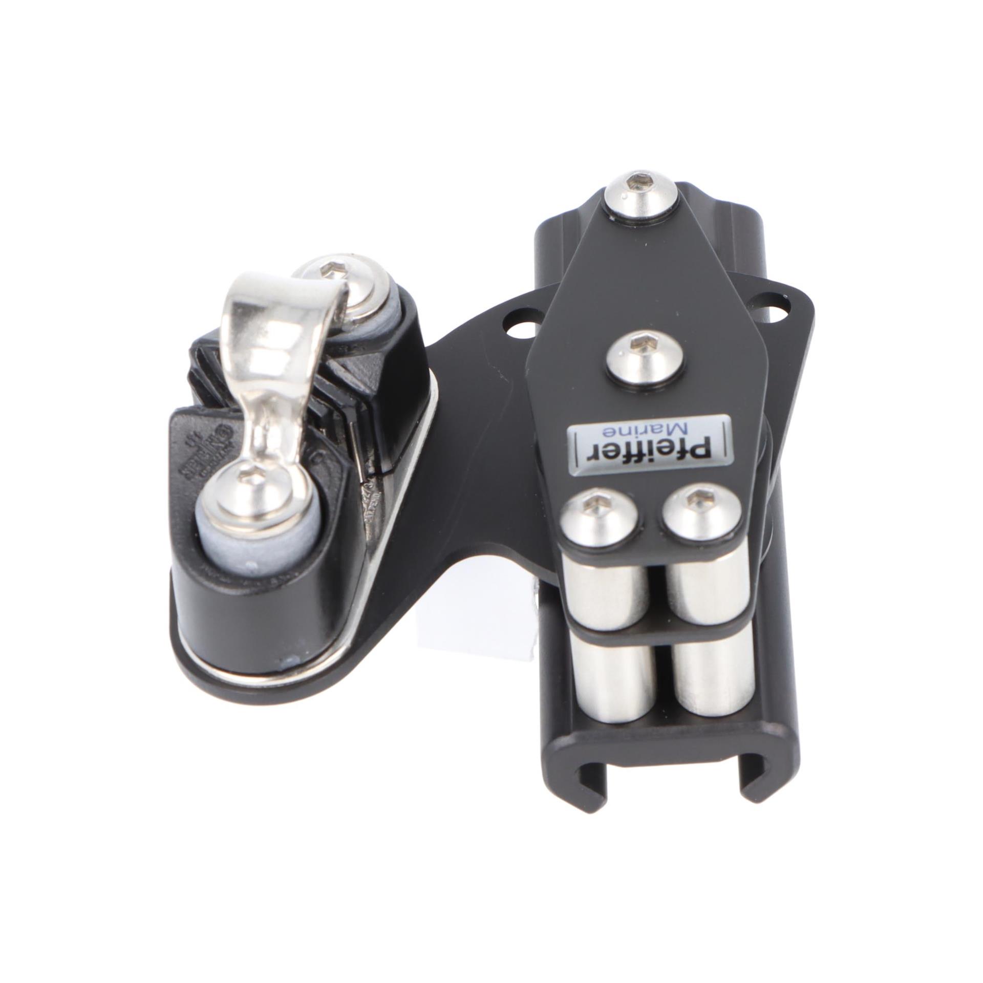 Der Kontrollblock rechts wird auf der Pfeiffer Travellerschiene 23x25 mm montiert und sorgt für präzise Leinenführung beim Reffen, Setzen und Trimmen. Durch die doppelte Rolle wird das Tauwerk sanft und effizient geführt, selbst unter hoher Belastung. Die Klemme ermöglicht das Fixieren der Position, um sichere Manöver bei jeder Segelsituation zu gewährleisten.