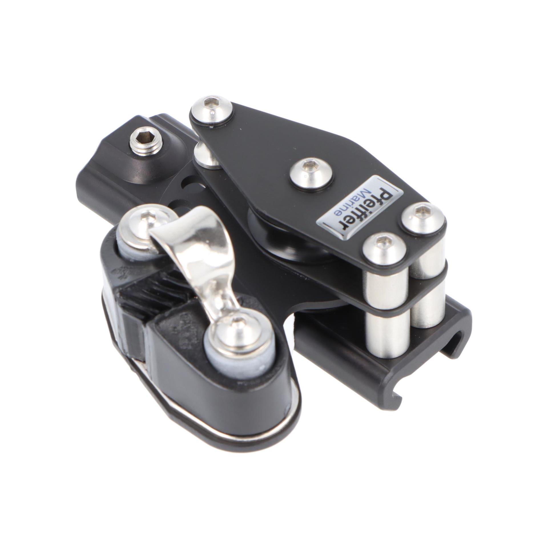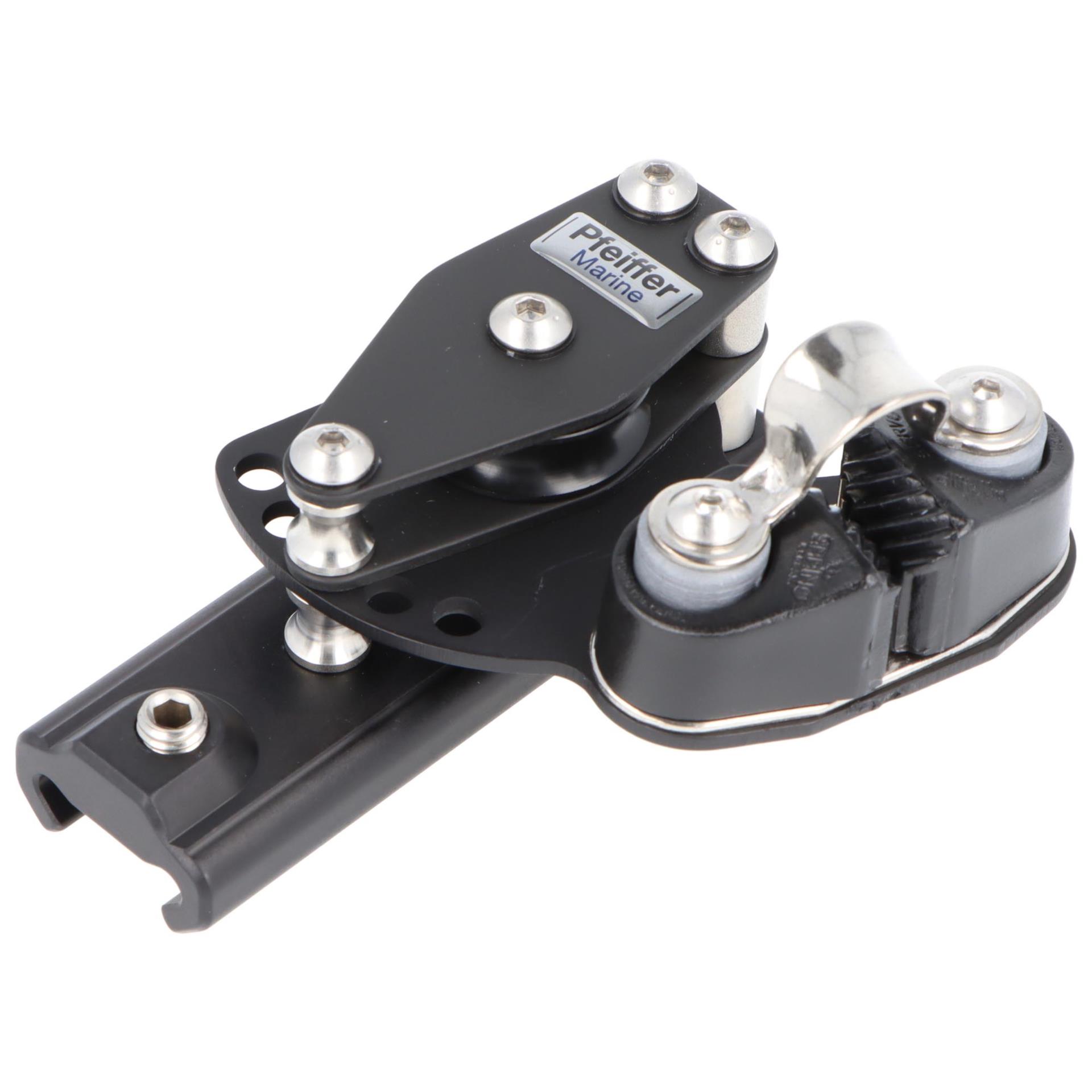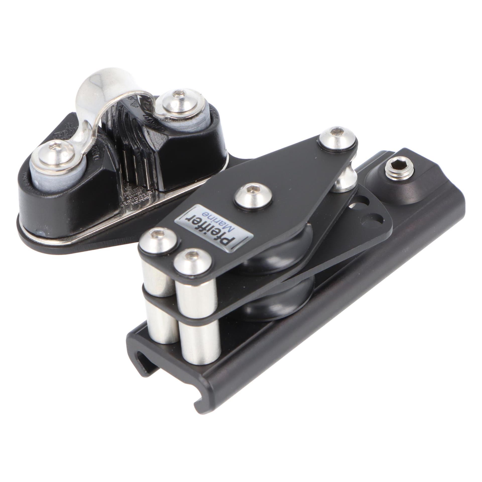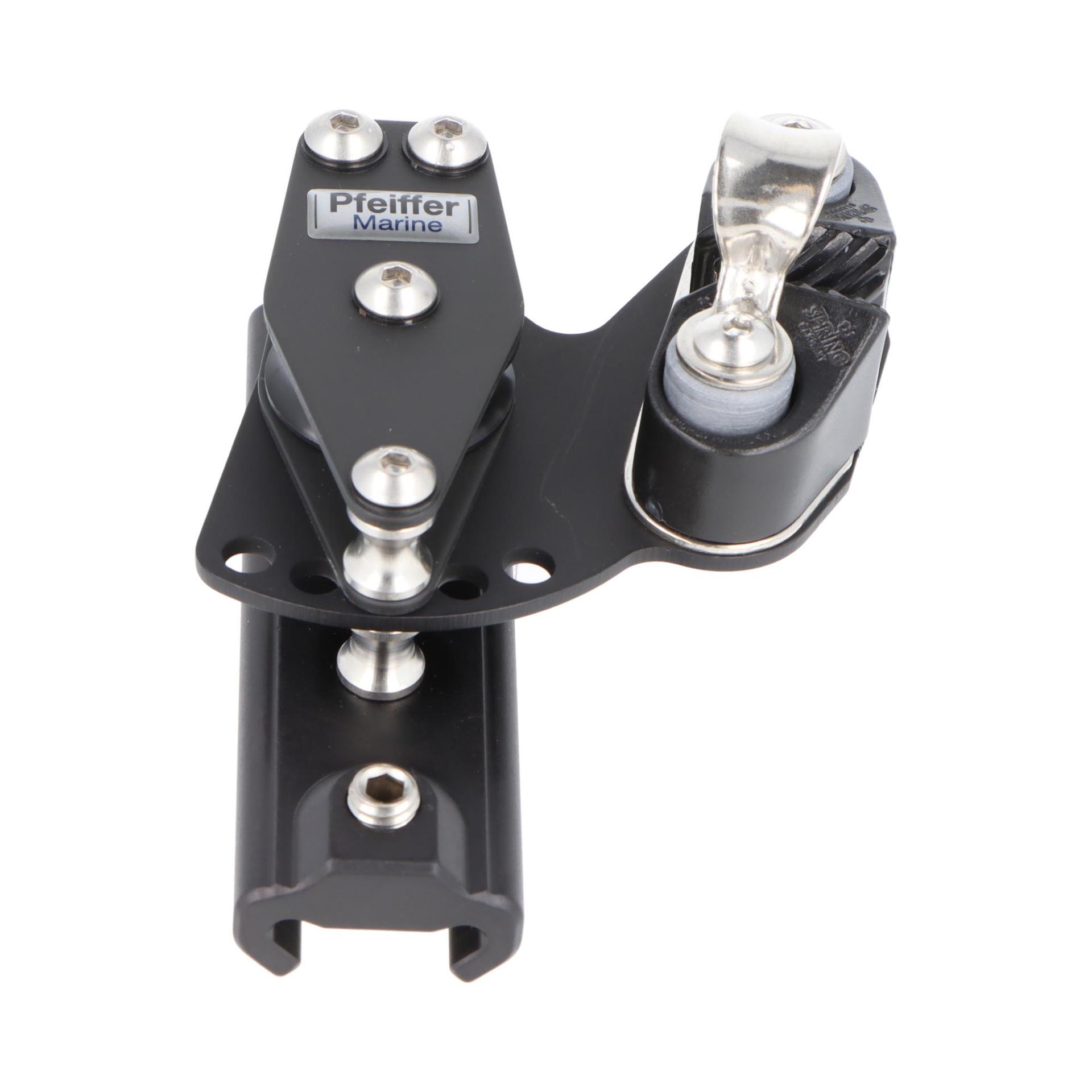 Der Kontrollblock rechts wird auf der Pfeiffer Travellerschiene 23x25 mm montiert und sorgt für präzise Leinenführung beim Reffen, Setzen und Trimmen. Durch die doppelte Rolle wird das Tauwerk sanft und effizient geführt, selbst unter hoher Belastung. Die Klemme ermöglicht das Fixieren der Position, um sichere Manöver bei jeder Segelsituation zu gewährleisten.