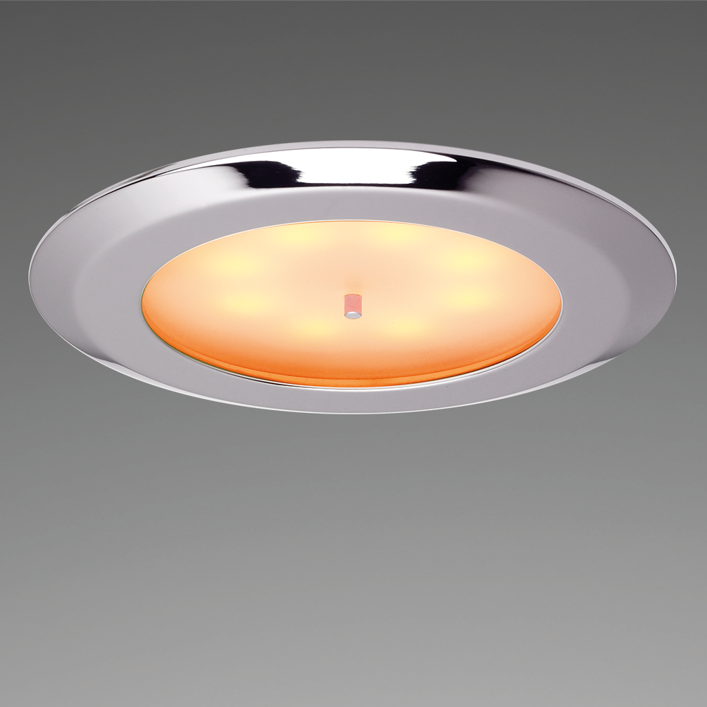 Entdecken Sie unsere flache, lichtstarke LED-Einbauleuchte mit angenehm warmweißer Lichtfarbe von 3.000 K – Made in Germany. Dank des breiten Abstrahlwinkels von 90° ist diese Leuchte ideal für Bereiche mit geringer Deckenhöhe. Das besondere Teamwork Main-Secondary System ermöglicht eine flexible Steuerung auch in Gruppen, sodass Sie Lichtkonzepte auf Booten und Schiffen ganz nach Ihren Bedürfnissen gestalten können. Die Leuchte ist außerdem optional auf farbiges Nachtlicht umschaltbar und überzeugt durch sanftes Dimmen per integriertem Soft-Taster.