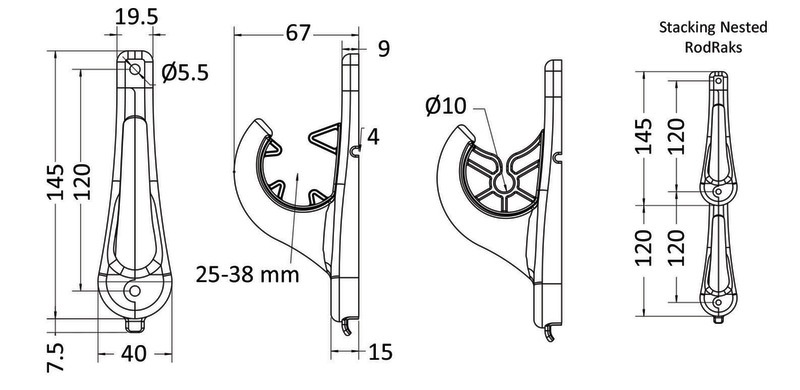Das System ist stapelbar, sodass mehrere Halterungen untereinander montiert werden können, ideal zum Organisieren von Ruten, Gaffs, Bootshaken, Keschern oder Paddeln. Hergestellt aus UV-stabilisierten, glasfaserverstärkten technischen Polymeren mit rostfreien Schrauben, bietet der RodRak langlebige und flexible Nutzungsmöglichkeiten.