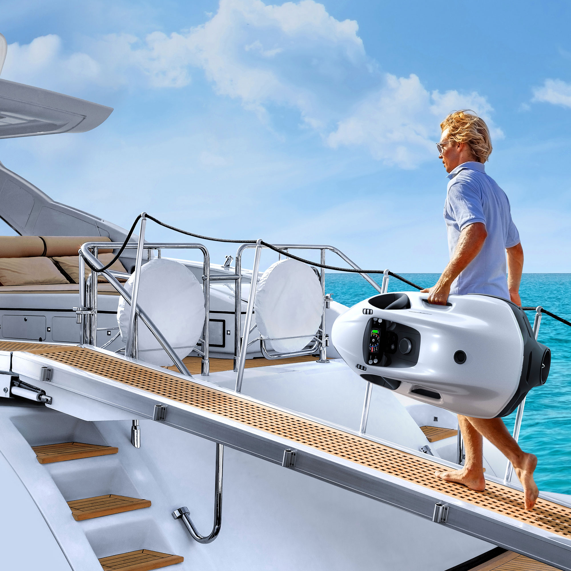• Mit seinem leistungsstarken 2,6 kW-Motor und einer Schubkraft von 60 TP liefert er kraftvollen Vortrieb und flotten Antrieb auf Wasser und unter Wasser.