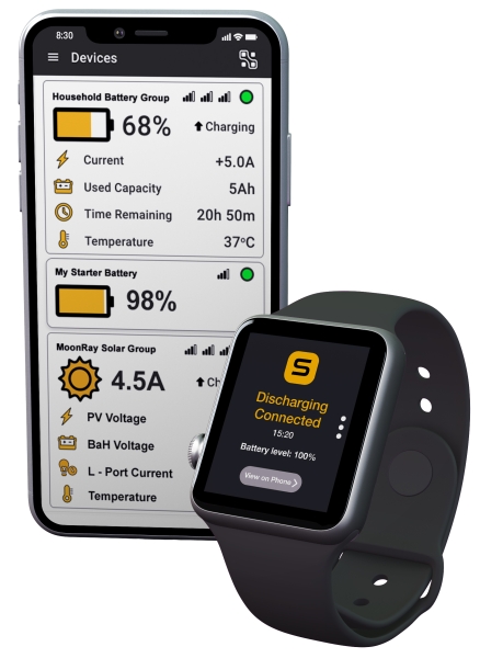 Mit dem optionalen Bluetooth-Modul erhalten Sie mit der SUNBEAMsystem App die volle Kontrolle über Ihr System. Es bietet Ihnen nicht nur Echtzeitdaten, sondern erlaubt Ihnen auch, mehrere MoonRay-Controller in einer Übersicht zusammenzustellen. Alle im System installierten SMART LITHIUM-Batterien werden automatisch angezeigt, so dass Sie das gesamte System vom Smartphone aus überprüfen können.