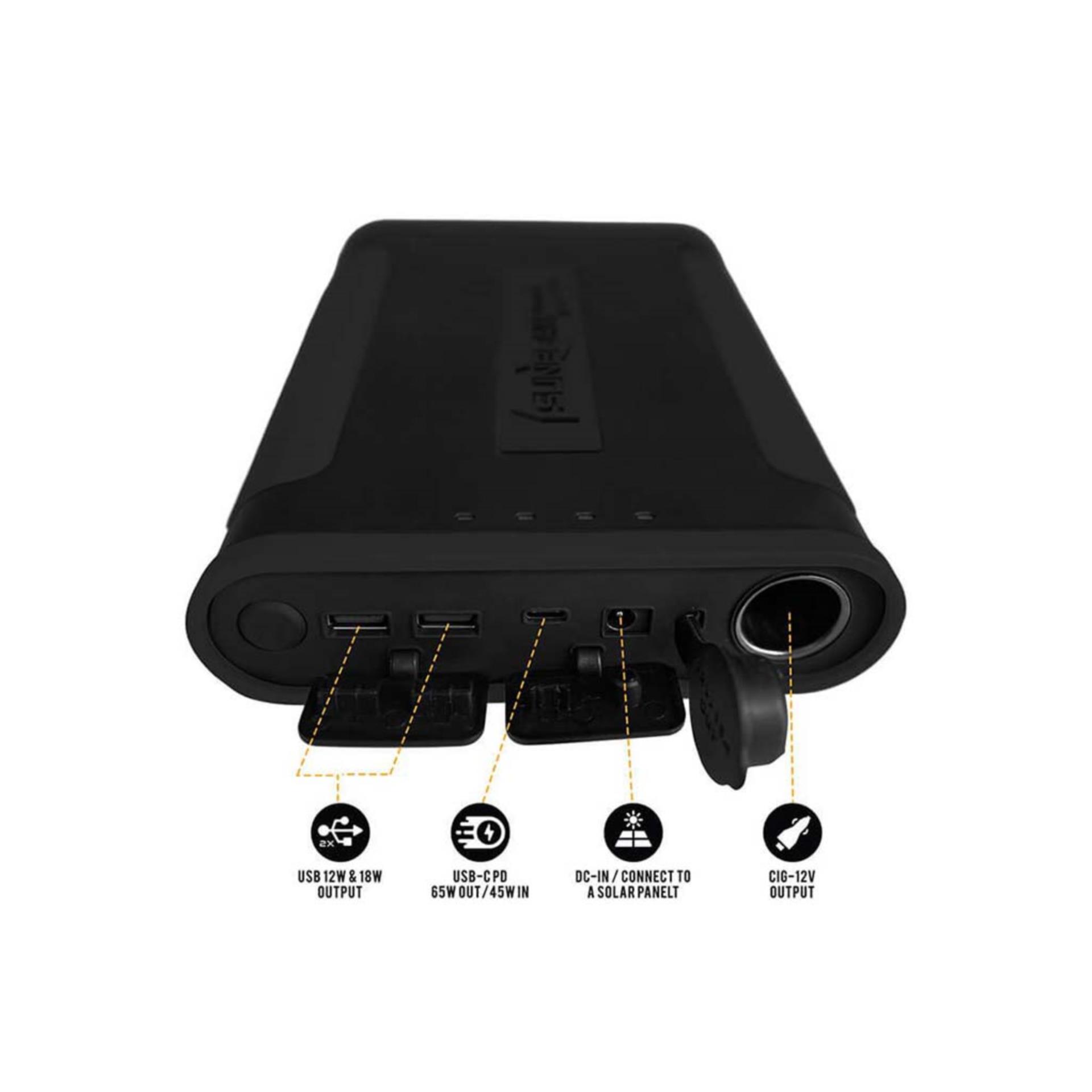 Sie kann eine tragbare elektrische Kühlbox im Eco-Modus bis zu 24 Stunden und bei voller Leistung 3–6 Stunden betreiben. Zusätzlich lässt sich ein optional erhältliches Solarpanel anschließen, das die Power Station lädt und gleichzeitig die 12V-Cig-Buchse sowie USB 1+2 mit Energie versorgt.