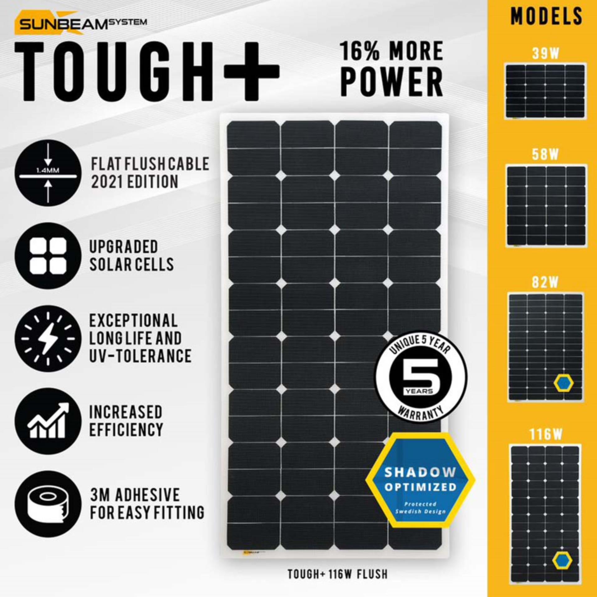 Alle Tough + Module sind mit dem flachen Flush 2.0 Kabel ausgestattet. Dieses verbesserte Kabel ist um 30% flacher und verfügt dennoch über 25% mehr Kupferquerschnitt als die Flush (Standard) Serie. Tough + wurde für eine schraubenlose Montage konzipiert. In Kombination mit dem neuen, schlanken Kabel entsteht eine schlanke Oberfläche, die sich ideal für die Integration der Module auf verschiedensten Oberflächen eignet. Jedes Tough + Modell wird mit Strukturklebeband für eine schnelle Montage auf gewölbten Oberflächen geliefert. Sunbeamsystem Tough+ Solarmodul