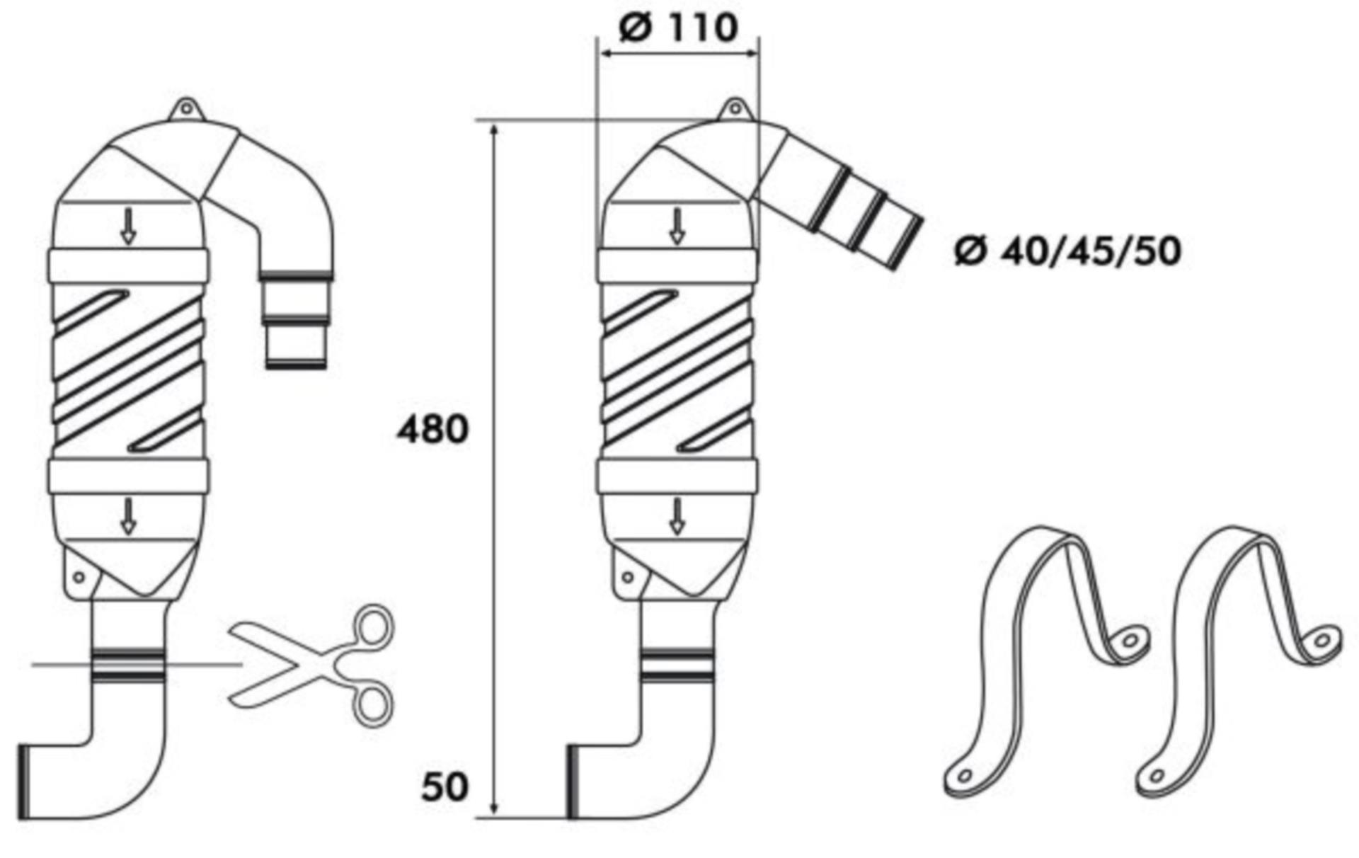 - Der Abgasschwanenhals ist mit Schlauchanschlüssen für flexiblen Abgasschlauch von 40, 45 und 50 mm Ø ausgestattet.