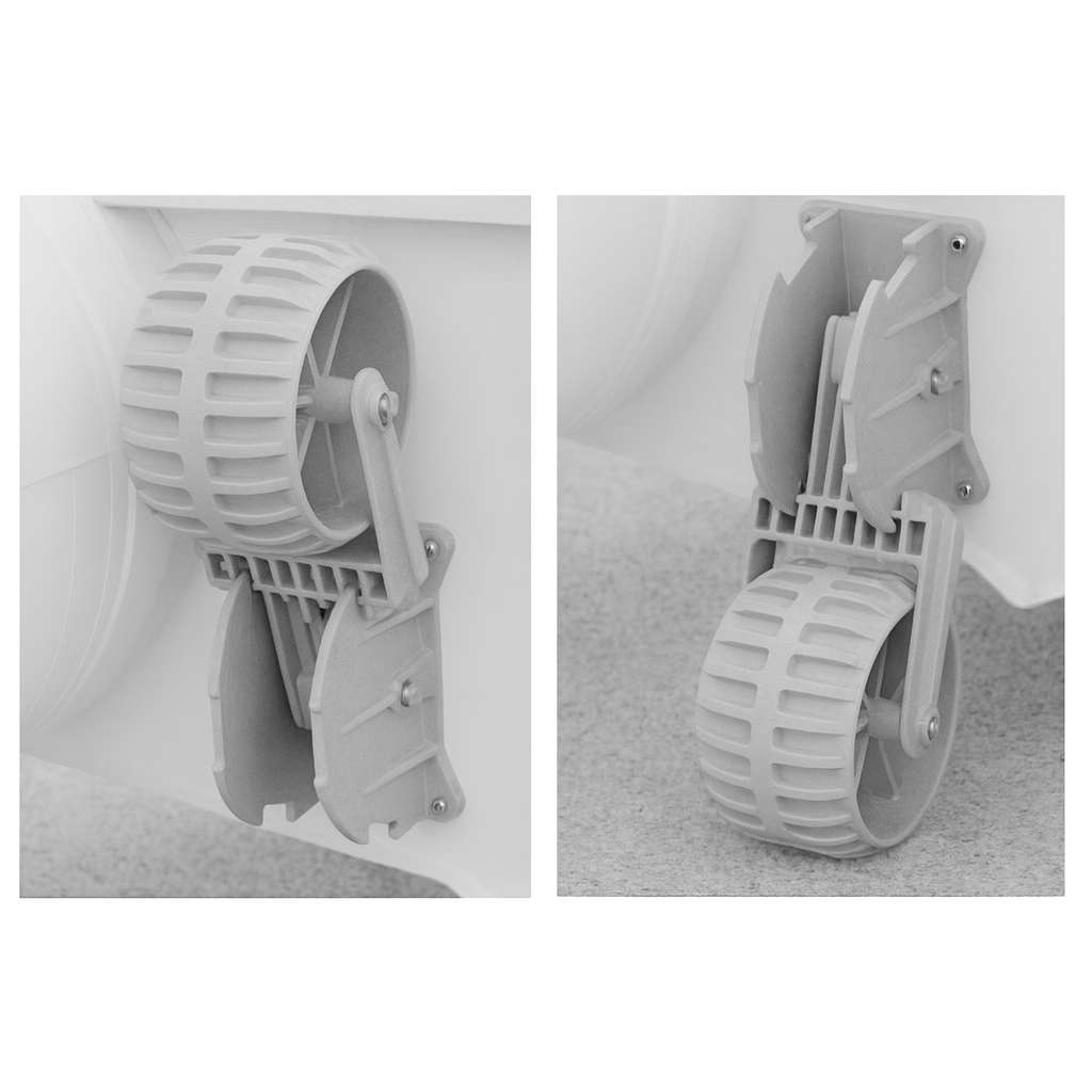 Ein integriertes Schutz- und Verriegelungssystem sorgt dafür, dass die Slipräder während der Fahrt im Wasser sicher in Ruhestellung verbleiben und nicht unbeabsichtigt ausklappen. Dadurch wird der Fahrbetrieb nicht beeinträchtigt und das Boot bleibt optimal manövrierbar.